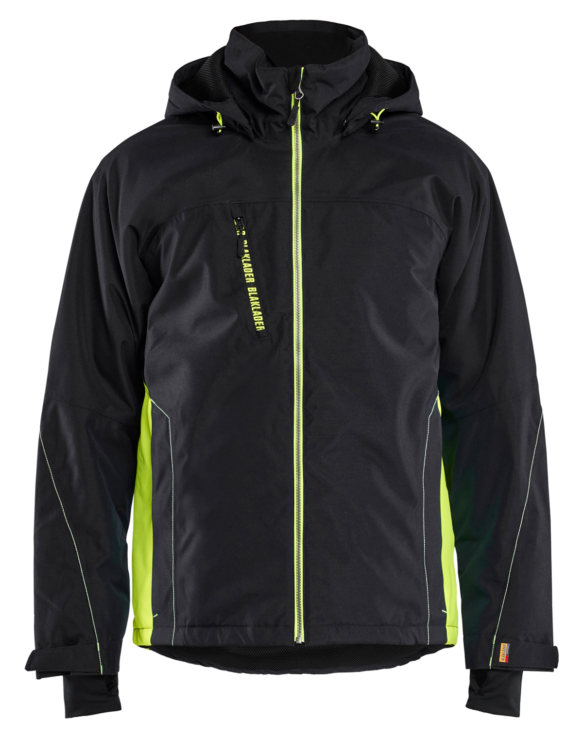 Optional kann eine Kapuze ergänzt werden. Je nach Bedarf stehen Modelle mit leichtem Steppfutter oder Mesh-Futter zur Verfügung. Beide lassen sich per Druckknopf befestigen. Für Einsatzbereiche ohne Sichtbarkeits-Anforderungen – etwa Werkstätten oder Hallenbereiche – ist die Jacke auch ohne Warnschutz erhältlich (Modell 4890). Damit passt sie in betriebliche Bekleidungs-Systeme, die sowohl Innen- als auch Außeneinsätze abdecken müssen.