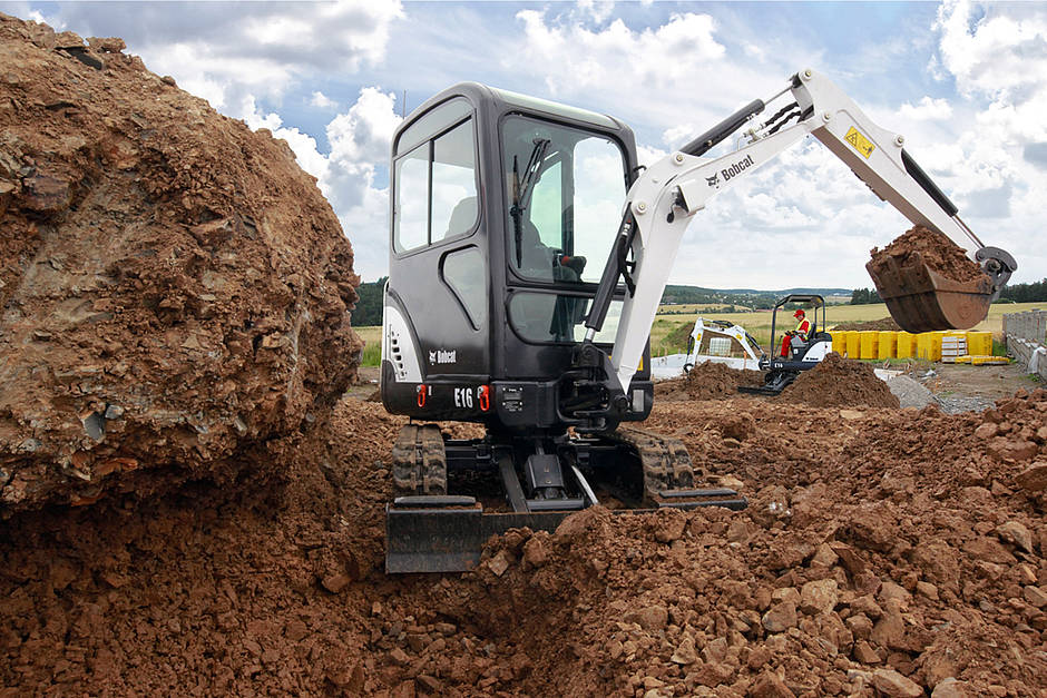 Weitere Merkmale, die zur hervorragenden Robustheit des E14 und E16 beitragen, sind die Seitenabdeckungen aus Stahl, der Schildzylinderschutz und der Einsatz von drei Rollen im Kettensystem, um die Lebensdauer der Gummiketten zu erhöhen.