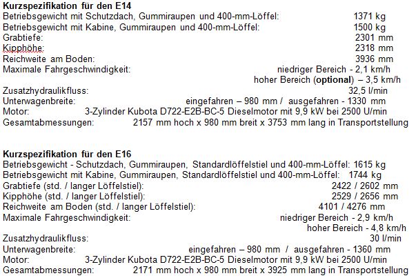 Sowohl der E14 als auch der E16 wird von einem 3-Zylinder 9,9 kW Kubota D722-Motor angetrieben. Unterstützt wird die hohe Grableistung durch die Stabilität, die der Planierschild und der niedrige Schwerpunkt der Maschinen bewirken.
