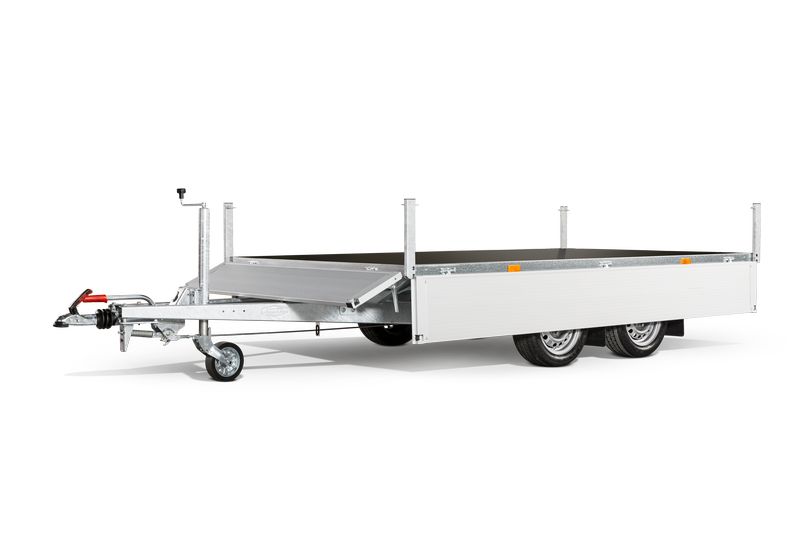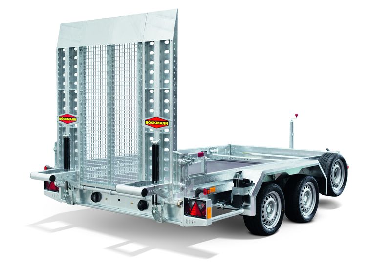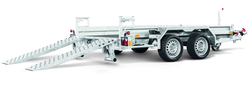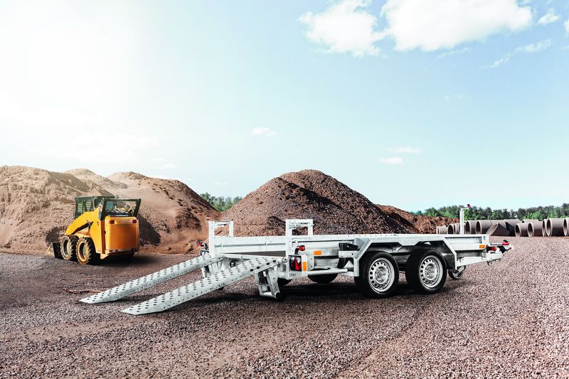 Die neuen Baumaschinentransporter zeichnen sich durch eine hohe Variabilität, hohe Belastbarkeit und besondere Stabilität aus. Für den Transport von Mini- und Midi-Baggern, von Arbeits- und Hebebühnen sowie für weitere Baufahrzeuge eignen sich die robusten Fahrzeuge bestens. Eine niedrige Ladehöhe von 480mm in Kombination mit den verstellbaren Abstützungsmöglichkeiten sichern das problemlose Beladen des Profi-Anhängers. Auch für schwere Baumaschinen ist das stabile Auffahrgitter im Zubehör geeignet.