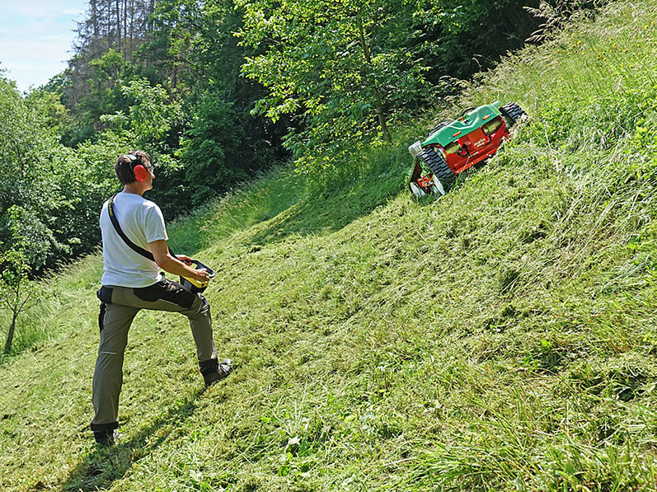 Gerade beim ferngesteuerten Mähen von Böschungen kann sich der Bediener fernab jeglicher Gefahrensituationen positionieren und ist vor direkten Belastungen wie Vibrationen, Lärm und Abgasen geschützt. Dies wirkt sich nicht nur positiv auf die Gesundheit aus, sondern erlaubt auch ein ruhiges, konzentriertes und sicheres Arbeiten. Außerdem informiert das große 2,8-Zoll-Display der Fernbedienung permanent über viele Gerätezustände, sodass sich der Bediener voll auf das Navigieren der Maschine konzentrieren kann. Ein Neigungssensor, der einen Sturz des Bedieners erkennt und die Maschine im Notfall selbstständig ausschaltet, sorgt für zusätzliche Sicherheit. Anwender haben die Auswahl zwischen einer Basic-Variante oder den professionellen Premium-Varianten mit 70 bzw. jetzt auch 80 cm Schnittbreite.