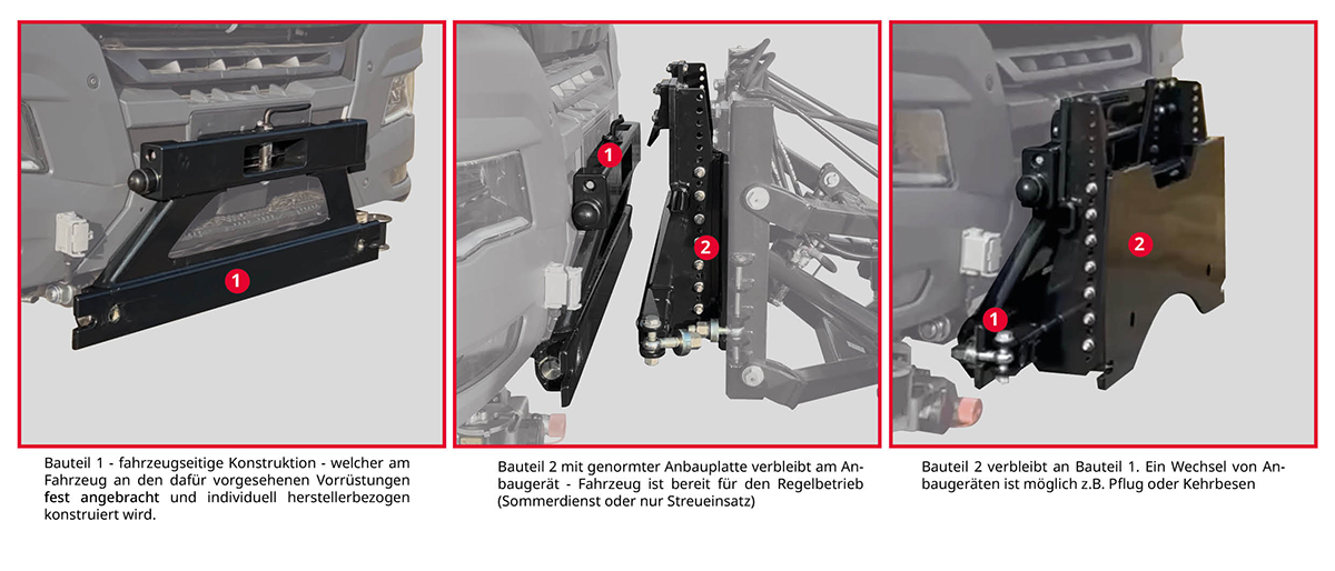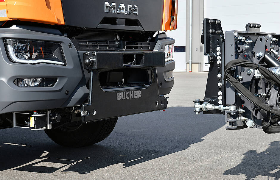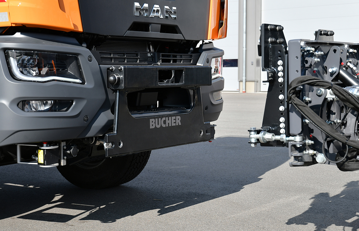 Die Bucher Municipal Wernberg GmbH hat eine neue zweiteilige Frontanbauplatte vorgestellt. Denn mit der Einführung der neuen General Safety Regulation (GSR) ab Mitte 2024 stehen Hersteller und Betreiber kommunaler Fahrzeuge vor neuen technischen Anforderungen: Künftig müssen alle Neufahrzeuge mit einem GSR-Sensor (Frontradar) für den Notbremsassistenten ausgestattet sein. Um die Funktion des Radars nicht zu beeinträchtigen, setzt Bucher Municipal statt der bisher starren Anbaulösung deswegen auf eine modulare Konstruktion: Ein dauerhaft am Fahrzeug verbleibendes Trägerelement (herstellerbezogen konstruiert) – Bauteil 1 – ermöglicht den uneingeschränkten Betrieb des GSR-Sensors. Die eigentliche Anbauplatte gemäß Norm F1 ist am Bauteil 2 befestigt und bei Bedarf schnell und einfach abnehmbar. Dabei bleibt die bewährte Befestigung über seitliche Klappschrauben erhalten. Für den Anwender bleibt die Handhabung also nahezu unverändert: Pflug oder andere Anbaugeräte werden wie gewohnt eingehängt und fixiert. Lediglich der Sensor muss über das Cockpit deaktiviert werden.