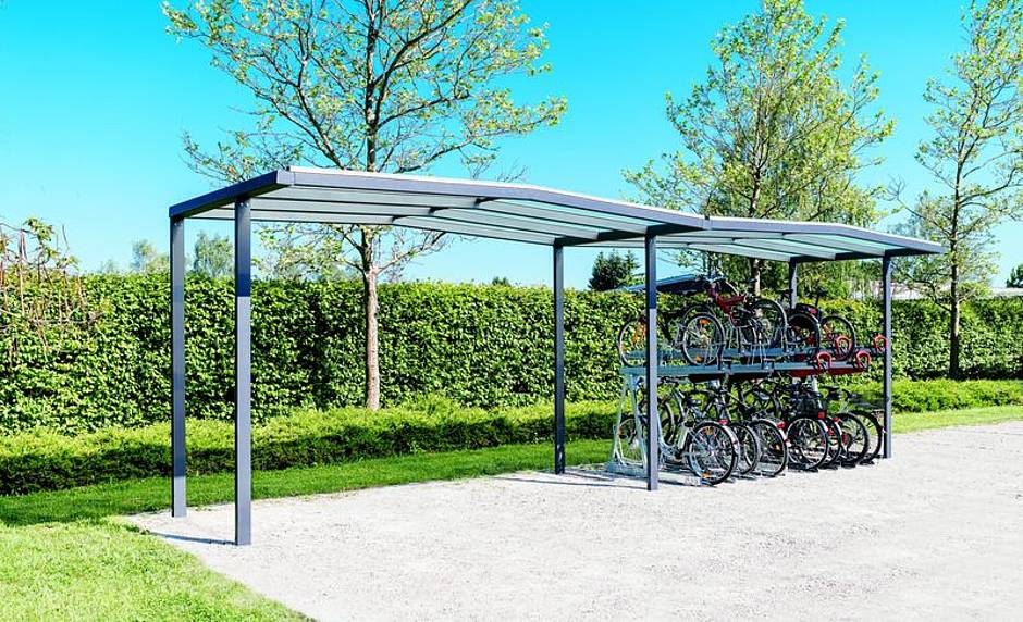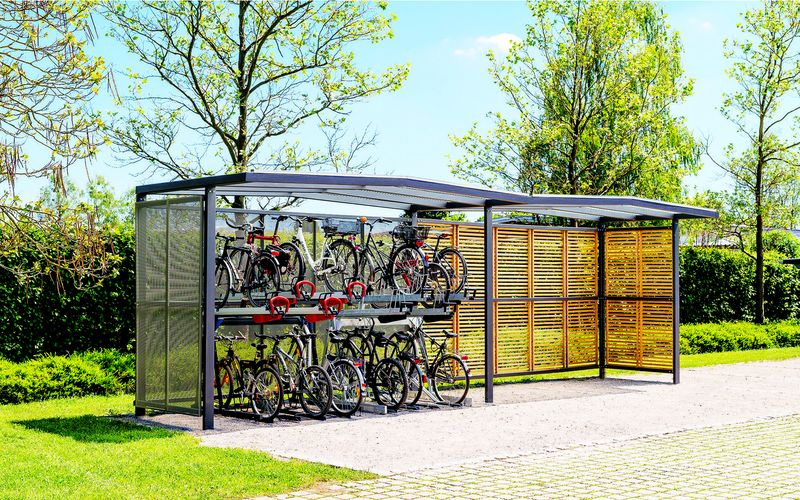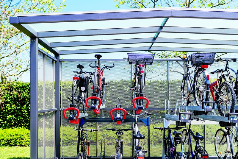 Städte und Kommunen fragen vermehrt nach effizienten Parkiersystemen, um ihre Flächen optimal zu nutzen. Die BWA jazz® Systemüberdachung integriert selbst Doppelstockparker, um möglichst viel Platz für Räder zu schaffen.