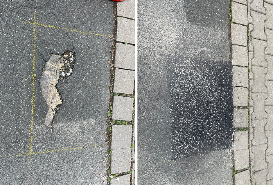 Schlaglöcher oder Aufbrüche an der Verkehrsfläche werden gemäß ZTV BEA-StB mit Heißmischgut (HMG-Gussasphalt oder WMG-Walzasphalt) beseitigt. Vor dem Einbau des Asphalts erfolgt eine fachgerechte Vorbereitung der Unterlage. Um die Schadstelle wird ein Vertikalschnitt vorgenommen, anschließend wird der schadhafte Bereich ausgebaut.