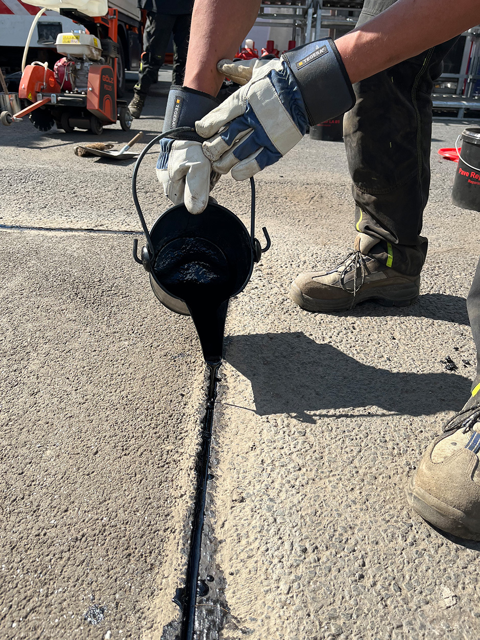 Offene Nähte, Fugen, Anschlüsse oder Rissbildungen werden vor dem Verfüllen mit bituminöser Vergussmasse aufgeweitet und getrocknet. Außerdem werden die Flanken mit einem speziellen Haftvermittler vorbehandelt. Breite Öffnungen werden mit dem Spezialasphalt Pave-Repair-WMG-2 bearbeitet.