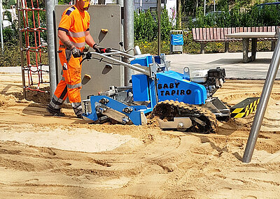 Mit der Sandreinigungsmaschine Baby Tapiro bietet die CFC-Sandreiniger D.A.CH. eine technische Lösung zur Reinigung und Aufbereitung von Sand-Spielplätzen, Fallschutzbereichen, Stränden, Beachvolleyball-Feldern und Kita-Außenflächen an. Die Maschine ist mit einem eigenen Antrieb über Gummiraupen ausgestattet, wodurch sie auch auf weichem Untergrund stabil bleibt. Daneben erfolgt der Antrieb über einen Honda-Benzinmotor, und die Bedienung kann durch eine einzelne Person erfolgen. Während des Betriebs wird der Sand durchkämmt, wobei Verunreinigungen wie Glasreste, Steine, Kunststoffe, Zigarettenstummel, organische Abfälle oder auch tieferliegender Unrat aufgenommen werden.