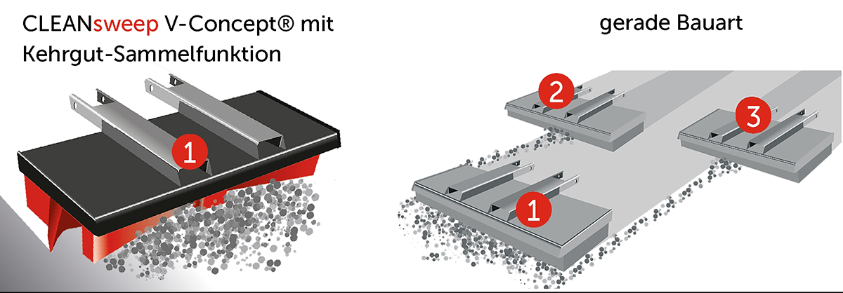 Eine V-förmige Anordnung der leistungsstarken V-Concept-Hochleistungsbürsten sammelt Roh-, Rest- und Betriebsstoffe effizient in einem einzigen Kehrstrich ein und leitet den gebündelten Schmutz direkt in die Mitte des Kehrbesens. Zudem verfügen die neuartigen Bürsten über eine bis zu viermal längere Lebensdauer im Vergleich zu herkömmlichen rotierenden Kehrwalzen, wodurch Ersatz- und Wartungskosten signifikant sinken. Für Betreiber bedeutet das niedrigere Betriebskosten und geringeren Wartungsaufwand, was zu einem messbaren Wettbewerbsvorteil im anspruchsvollen Tagesgeschäft führt.