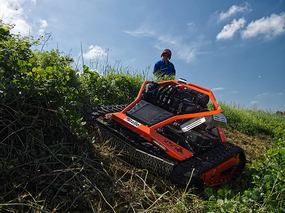 Stella Engineering arbeitet unermüdlich daran, die eigenen Geräte weiterzuentwickeln. So sind z.B. ab Herbst neue Features für die Mähraupe Stella URUS erhältlich. Zum erweiterten Schutz des Bedieners wurde am hinteren Ende der Maschine ein doppelreihiger Kettenvorhang angebracht. Des Weiteren wurde eine Steinschlagprüfung durch den TÜV Rheinland durchgeführt. Für eine bessere Wärmeisolierung des Auspuffstopfes wurden die entsprechenden Schutzbleche modifiziert. Auf Seiten der Arbeitsmöglichkeiten hat sich auch einiges getan. So wurde eine Schnitthöhenverstellung von 50 bis 130 mm realisiert und zum randnahen Mähen ist der Anbau eines seitlichen, hydraulisch schwenkbaren, Mähauslegers für den Heckanbau möglich. Zum Anbau weiterer Anbaugeräte verfügt die Maschine über ein elektrisch betätigtes Kuppeldreieck, an dem z.B. Schneeräumschilder und Kehrbürsten in den Maßen 160x50cm Platz finden. Alternativ ist auch der Anbau von Wildkrautbürsten mit 70cm Breite und weiteren Anbaugeräten wie Doppelmesserbalken, Heuwende, Rechen usw. möglich.