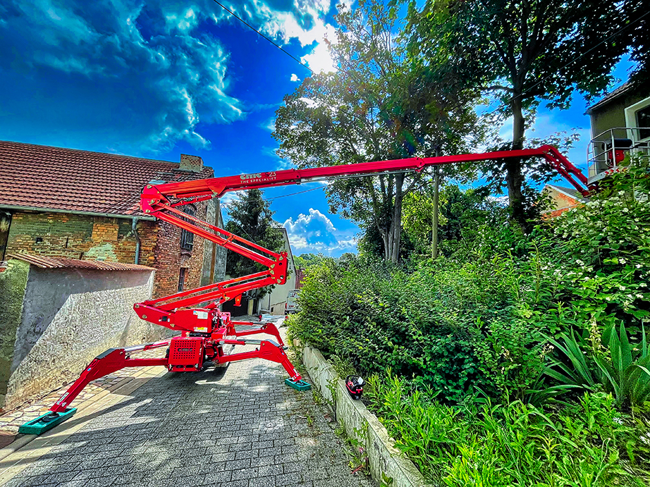Bereits bei der Vorführung im Sommer zeigte sich, dass die CMC-S23 auch an beengten Steigungen einsetzbar ist, wo der Einsatz anderer Arbeitsbühnen im Vorfeld nicht auf einfache Weise möglich war. So hatte die Gemeinde einen direkten Vergleich und entschied sich daher für eine Bühne vom Hersteller CMC.