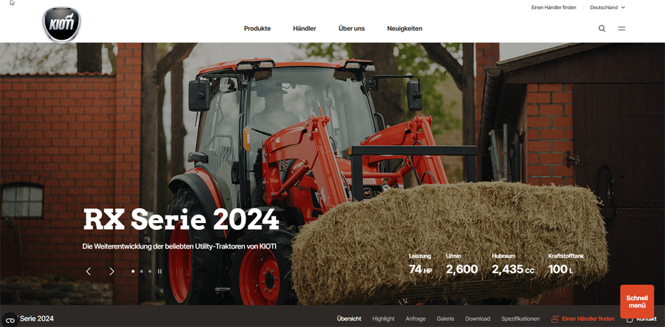 KIOTI hat jüngst eine brandneue Website für Deutschland gelauncht. Wer nach Informationen zu den vielseitigen, verlässlichen und einfach zu bedienenden Kompakttraktoren, Mehrzweckfahrzeugen (UTV) und Nullwendekreismähern des renommierten Landmaschinenherstellers sucht, kann dies ab sofort über www.kioti.de tun. Die neue Plattform zeichnet sich durch ein luftiges, modernes und nutzerfreundliches Design aus, dabei werden alle Inhalte natürlich auch auf mobilen Endgeräten dargestellt.