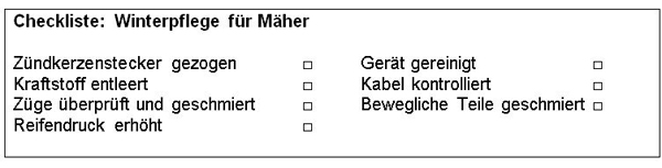 Vor der Inbetriebnahme im Frühjahr sollte der Mäher erst zum Check-Up beim Fachhändler. Zu den wichtigsten Maßnahmen gehören: Öl wechseln (beim 4-Takt-Motor), Luftfilter und Reifendruck prüfen, Messer schärfen oder gegebenenfalls austauschen.