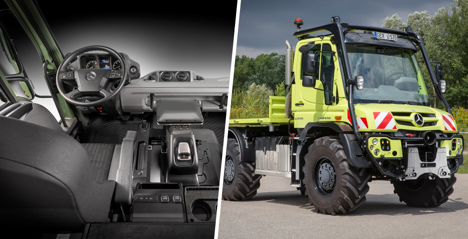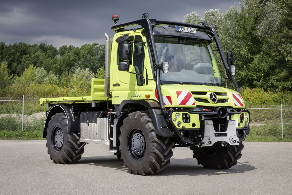 Die hohe Motorisierung des Unimog U 535 354 PS entspricht dem Wunsch vieler Kunden im schweren Gewichtssegment mit zulässigen Gesamtgewichten von bis zu 16,5 Tonnen. In Verbindung mit der mechanischen Heckzapfwelle zur Abnahme der vollen Motorleistung können so leistungszehrende Geräte, wie zum Beispiel ein Holzhacker, betrieben werden. Auf bis zu 89 km/h kann der Unimog beschleunigen. Mit dem synergetischen Fahrantrieb EasyDrive ist ein schneller Wechsel zwischen dem Schaltgetriebe und Hydrostat für stufenloses Fahren bis 50 km/h möglich. Im Work-Modus kann mit EasyDrive die Arbeitsgeschwindigkeit unabhängig von der Motordrehzahl stufenlos eingestellt und mit der Tempomatfunktion gehalten werden. Dank der optionalen Reifendruckregelanlage tirecontrol plus kann der Fahrer auf dem Feld per Knopfdruck Luft aus den Reifen ablassen und bei Straßenfahrt wieder aufpumpen, und das sogar während der Fahrt. Eine größere Aufstandsfläche der Reifen erhöht die Traktion und begünstigt bodenschonendes Fahren und Arbeiten.