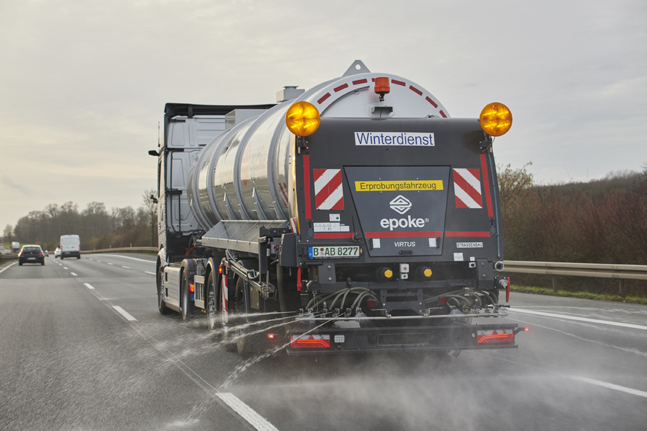 Mercedes-Benz Trucks und die Autobahn GmbH des Bundes haben Anfang Februar gemeinsam den batterieelektrischen eActros 600 im Winterdienst erprobt. Die Autobahn GmbH setzte hierfür einen Prototyp des E-Lkw auf einem Teilabschnitt der A2 zwischen Hamm und Bielefeld mit einem Sattelauflieger der Firma Epoke ein. Als präventives Mittel gegen Glatteis kam Sole zum Einsatz. Dabei ermöglicht der Solesprüher-Auflieger das Ausbringen der Sole bei Geschwindigkeiten von 80 km/h im laufenden Verkehr bis zu einer Streubreite von zwölf Metern. Angetrieben wird der Streuer autark vom Zugfahrzeug über das hintere Rad des Sattelaufliegers. Via Funkfernbedienung erfolgt eine kabellose Steuerung des Solesprühers. Laut Daimler Truck-Unternehmenszentrale zeige diese Erprobung, dass Einsätze bei der präventiven Soleausbringung im Winterdienst auch mit einem E-Lkw bewältigt werden können.