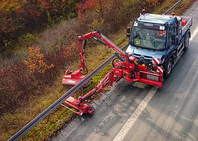 Der ausgestellte Unimog U 430 ist mit einer Mähkombination an der Fahrzeugfront und einem Streuautomaten versehen. Über eine Reichweite von sechs Metern (sieben Meter mit Teleskop) verfügt das Frontausleger-Mähgerät MFK 500 von Mulag und kann beidseitig eingesetzt werden. Wahlweise über die fahrzeugseitige Leistungshydraulik oder über die Frontzapfwelle erfolgt der Antrieb. Ein Lichtraumprofil-Schneidgerät, FSG 2000, von Mulag lässt sich zur Gehölzpflege und zum Freischneiden von Straßen und Gleistrassen einsetzen. Beide Anbaugeräte können an die Schnellwechselvorrichtung des Unimog montiert werden.