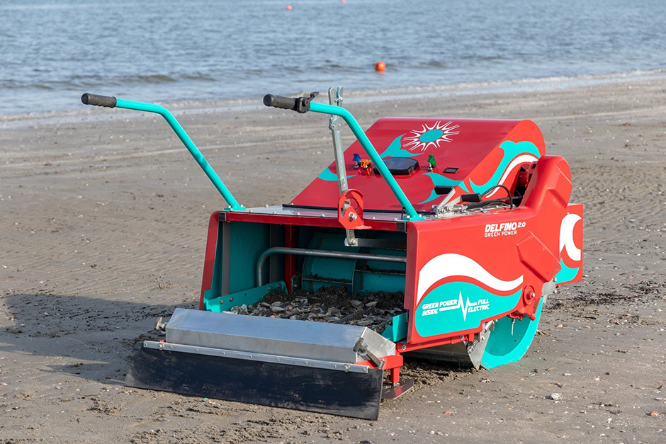 Die seit 30 Jahren bewährte Sandreinigungsmaschine DELFINO ist ab März auch in elektrifizierter Ausführung erhältlich. Dadurch wird es möglich, während der Betriebs- und Besuchszeiten von Strandanlagen und Spielplätzen Sandreinigungen durchzuführen. Das neue, umweltfreundliche, elektrische und drehmomentstarke Antriebskonzept ermöglicht dem Bediener ein komfortables Vorwärts- und Rückwärtsfahren auch auf engsten Sandplätzen. Mechanisch getrennte Antriebe für den Fahrbetrieb und das Siebdeck generieren eine hohe Durchsatzleistung.
