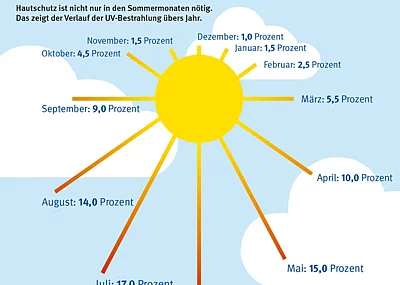 Auch sollte man sich durch einen bewölkten Himmel nicht täuschen lassen. Wolken mindern zwar die Intensität der Sonnenstrahlen, heben sie aber nicht vollständig auf. Zusätzlich zur Jahreszeit ist bei der Beurteilung der Hautgefährdung der aktuelle Aufenthaltsort zu berücksichtigen. Die UV-Strahlung kann außerdem durch Schnee, Wasser oder metallische Oberflächen (z.B. Bleche) reflektiert und dadurch erheblich verstärkt werden.