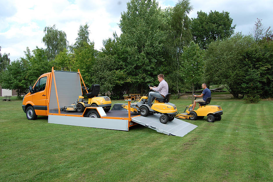 In Verbindung mit der Werkseitig lieferbaren Luftfederung beträgt die Ladehöhe nur 460 mm. Somit lassen sich viele selbstfahrende Bau- und Galabaumaschinen auffahren und transportieren. Das Heck kann wahlweise mit einer normalen 400 mm Heckklappe oder mit der 2-fach klappbaren Aluminium Auffahrrampe ausgestattet werden. Die Gasdruck unterstütze Auffahrrampe kann mit 1.000 (bis max. 1800 kg) belastet werden.