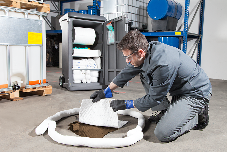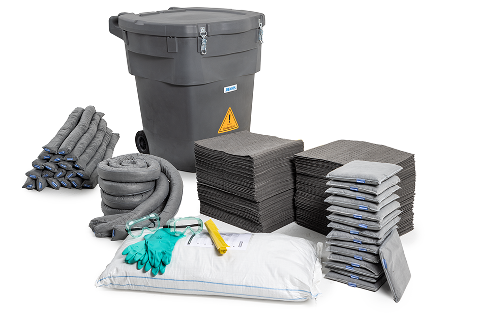 Mit dem mobilen DENSORB-Notfallset sind Bindevliese immer da, wo sie benötigt werden – jederzeit sauber, schnell und effizient zur Hand. Diese Sets enthalten alles, was für die Eindämmung und Aufnahme von Gefahrstoffleckagen erforderlich ist. Schlangen werden zur Eindämmung von Leckagen verwendet, um ein Weiterfließen zu verhindern. Rollen, Matten und Kissen werden zur Aufnahme ausgelaufener Flüssigkeiten eingesetzt. Ergänzt wird das Set durch Schutzhandschuhe und Schutzbrille für den Anwender sowie Entsorgungsbeutel für benutzte Bindevliese. Seit kurzem ist das Notfallset nicht nur im kompakten Caddy, sondern auch im großen Aufbewahrungsfass erhältlich. Der fahrbare Behälter aus PE ermöglicht eine Aufstellung im Außenbereich und ist dank der robusten Räder geländegängig. Laut Hersteller kann die im Notfallset XL bereitgestellte Menge an Bindemittel bis zu 445 Liter Öl aufnehmen.