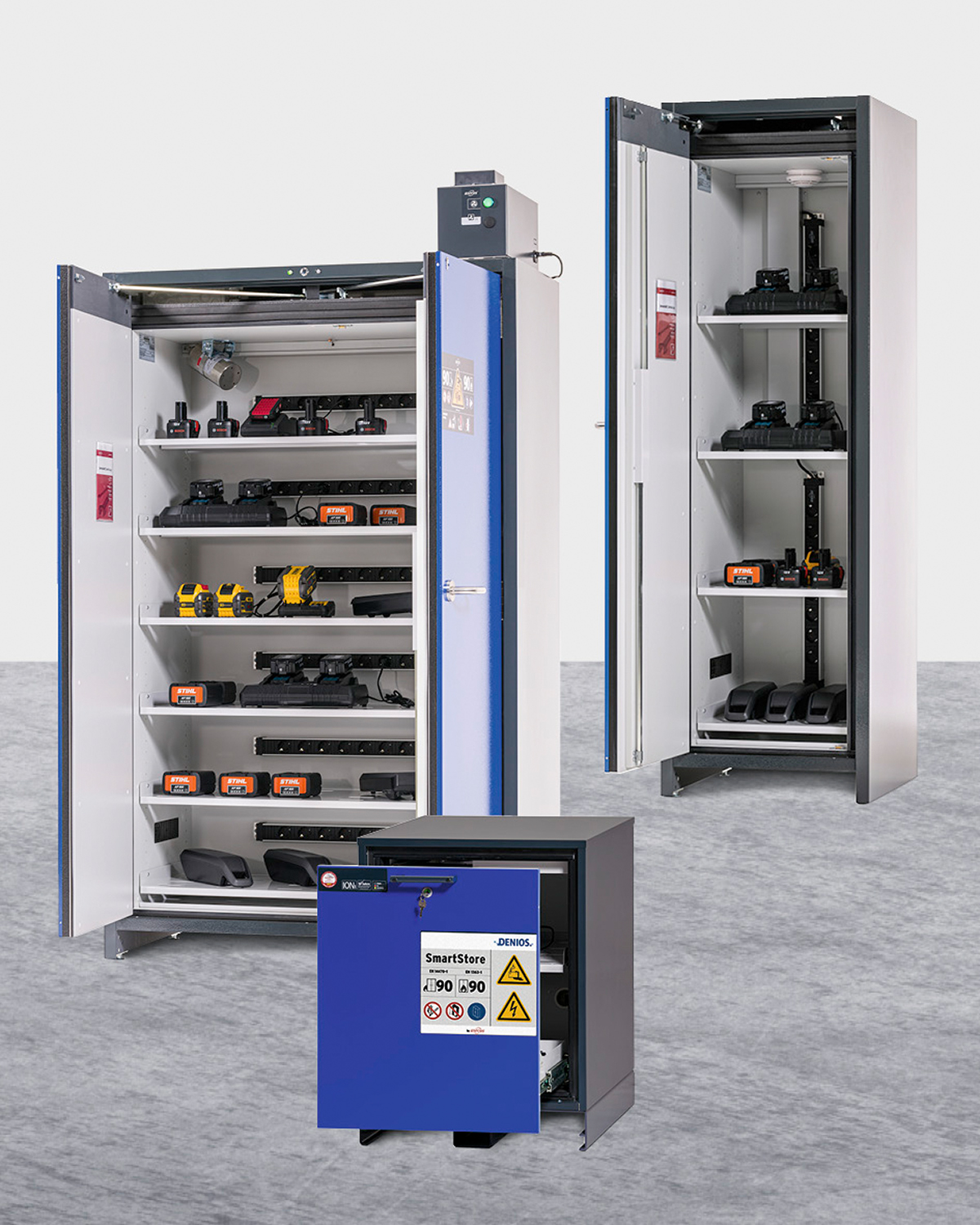 Dank verschiedener Sicherheitsfeatures bieten die Lager- und Ladeschränke einen Feuerwiderstand von 90 Minuten – sowohl von außen nach innen gemäß DIN EN 14470-1 als auch von innen nach außen in Anlehnung an DIN EN 1363-1. Die Modelle SmartStore Pro und Ultra sind zusätzlich durch Realbrandversuche auf das Szenario eines Thermal Runaway getestet und nach VDMA 24994 zertifiziert. Isolierte Fachböden verhindern eine Propagation zwischen den Lagerebenen. Eine 3-Punkt-Verriegelung sorgt für eine komfortable Bedienung und garantiert gleichzeitig geprüfte Sicherheit bei geschlossenen Türen im Brandfall. Auch eine Druckentlastungsklappe mit Rauchgasanschluss ist in der Serienausstattung vorhanden. Die eingebaute technische Lüftung verhindert einen Wärmestau beim Laden der Akkus. Integrierte Sensorik und automatische Warnmeldungen ermöglichen die frühzeitige Erkennung potenzieller Gefahren und das sofortige Einleiten geeigneter Gegenmaßnahmen.