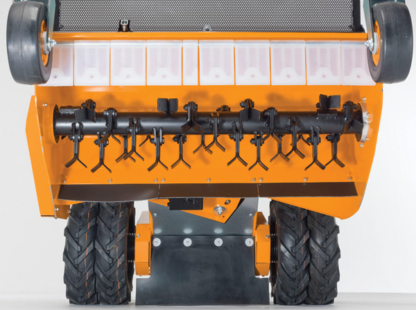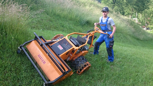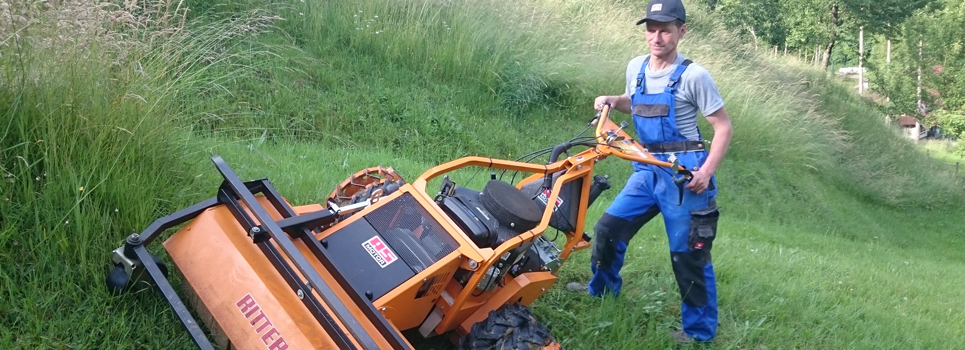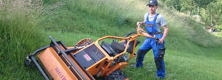 Während bei der Vorführung die Agrarprofil-Doppelbereifung des Schlegelmähers zum Einsatz kam, hat sich Schmid dann dazu entschieden, Eisenräder als Sonderzubehör anzuschaffen. Damit hat der Schlegelmäher am Hang eine noch bessere Kletterfähigkeit und Traktion. Egal wie unwegsam das Gelände auch sein mag, der Motor mit 5-Gang-Getriebe und Differenzialsperre des AS 901 kommt damit zurecht. „Der Motor hat sich noch niemals ungewollt abgestellt. Egal wie hoch der Bewuchs ist und selbst dort, wo es so steil ist, dass ich selbst fast nicht mehr stehen kann“, erklärt er. Wichtig für die Sicherheit am Hang: Wenn der Lenker samt Antriebshebel losgelassen wird, kommt das Gerät zuverlässig zum Stehen. Dafür, dass der Schlegelmäher auch im schwierigen Gelände handlich und wendig bleibt, sind die Einzelrad-Lenk- und Bremskupplungen in Verbindung mit den um 360 Grad drehbaren Vorderrädern verantwortlich. Schmid dazu: „Bei Arbeiten parallel zum Hang muss man nur darauf achten, dass der Schlegelmäher vorne oben bleibt.“