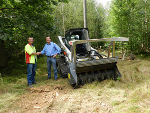 Für Franz-Paul Schloß, Geschäftsführer der Firma, gab es bei der Neuanschaffung keine Alternative zur Bobcat-Maschine: „Für mich ist Bobcat, was die Leistung der Maschinen und die Auswahl an Anbaugeräten angeht, konkurrenzlos. Ich habe mich für den Kompakt-Raupenlader T770 entschieden, weil ich mit dieser Maschine flexibler denn je bin. In Zukunft kann ich mir jedes Anbaugerät einfach dazu mieten, das neben dem Forstmulcher für meine Arbeiten nützlich ist.“ Darüber hinaus ist die Kombination aus T770H (High Flow) und Forstmulcher ideal für dieses Aufgabengebiet. Sowohl der Lader als auch das Anbaugerät lassen sich so präzise steuern, dass angrenzender Bewuchs nicht beschädigt wird. Auf dem stark unebenen Gelände, das an einigen Stellen auch extreme Hanglagen aufweist, bietet der T770 durch sein Raupenfahrwerk selbst auf aufgeweichtem Untergrund immer eine hervorragende Traktion und schont, durch den im Vergleich zu Radfahrzeugen geringem Bodendruck, gleichzeitig den Untergrund.