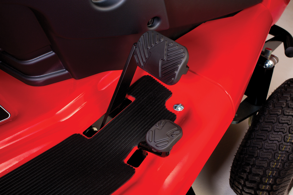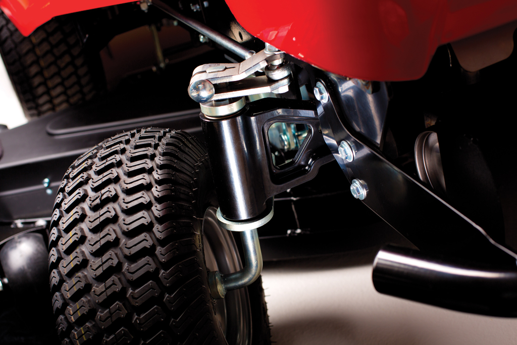 Herzstück eines jeden Rasentraktors ist das Mähwerk, die Ingenieure haben es bei den neuen ECHOTRAK-Modellen gründlich überarbeitet. Die seitlichen Schutzschienen schützen das Mähwerk vor Beschädigungen und dienen beim Kontakt mit Hindernissen als Führung. Eine sinnvolle Schutzeinrichtung, denn nicht selten gleicht die Mäharbeit einem Hindernisparcours, bei dem sich einem Bäume, Mauern und Zäune in den Weg stellen. Die neue Mähwerksaufhängung lobt Frank Ueberfuhr, technischer Leiter von ECHO Motorgeräte, als wichtigste Änderung. Das Spannen des Mähantriebsriemens erfolgt bei dieser neuen Aufhängung automatisch: Eine Spannrolle mit vorgegebener Federkraft erhält die Spannung. Somit hängt das Mähwerk fest in seinen Aufhängepunkten und muss nur einmal eingestellt werden, eine Verstellung zum Untergrund ist kaum möglich. Das Ergebnis: geringerer Wartungsaufwand und ein besseres Schnittbild – egal auf welchem Gelände.