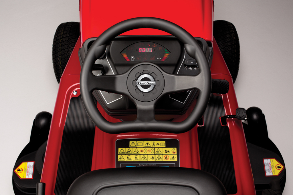 Wer große Flächen zu mähen hat und lange Zeit auf dem Rasentraktor verbringt, stellt hohe Anforderungen an den Komfort seines Arbeitsgerätes und ermüdungsfreies Arbeiten ist besonders dann notwendig. Ergonomie war ein wichtiges Leitprinzip bei der Entwicklung des neuen ECHOTRAK. Die Arbeit mit dem Rasentraktor soll möglichst komfortabel sein, gleichzeitig will man ein ideales Ergebnis. Das Lenkrad ist daher nicht althergebracht rund, sondern an der Unterseite abgeflacht, das macht das Auf- und Absteigen leichter. Diese Abflachung hilft auch, beim Mähen die Bahn gerade zu halten, denn schon ein minimaler Lenkeinschlag fällt viel schneller auf als bei einem einfachen runden Lenkrad. Die Neuausrichtung der Haube und der Mittelkonsole bietet dem Nutzer angenehme Beinfreiheit. Die großen Fahrpedale sind sehr leichtgängig und auch der Fahrersitz ist wie bisher individuell verstell- und anpassbar. Aber zu Ergonomie zählt auch Lärmschutz. Für einen Rasentraktor ist der ECHOTRAK erstaunlich leise. Das liegt zum einen an der Konstruktionsweise der Motorhaube. Durch die doppelte Wand und die schallisolierende Wirkung der Luftkammer dazwischen wird der Motorenlärm stark gedämpft. Zum anderen wurde auch der Auspuff besonders lärmreduzierend aufgebaut.