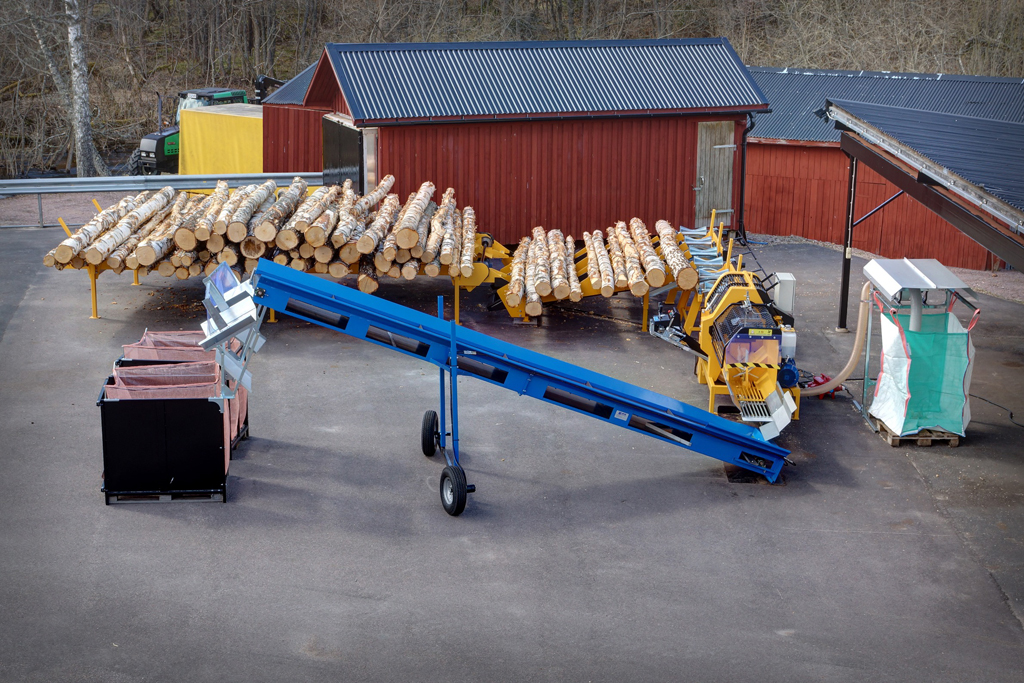 Mit einer zweiten Person lässt sich die Tagesleitung auf bis zu 50 - 60m³ Brennholz steigern. Das höhen- und seitenverstellbare Förderband mit einer Länge von 6 m und einer Breite von 60 cm sorgt für den zügigen Abtransport des geschnittenen Holzes. Die bereitgestellten Netzsäcke werden in einem Gestell vorgeformt, befüllt und für den Abtransport auf Europalette vorbereitet.