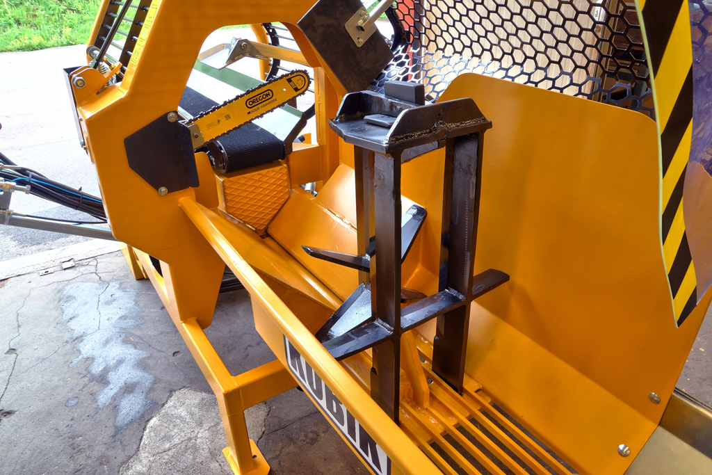 Bevor das geschnittene Holz das Förderband erreicht, werden Splieten und lose Rindenreste aufgefangen, damit nur sauberes Brennholz in die Verladesäcke gelangt. Die KUBIK 2 kann neben den ab Werk installierten Spaltkreuzen mit zwei zusätzlichen bestückt werden und erlaubt so eine Vielzahl von Spalteinstellungen. Von 2, 4, 6, 8 bis zur 16-fachen Spaltung ist diese Maschine so flexibel wir der Anspruch Ihrer Kunden. Die Spaltkreuze sind hydraulisch verstellbar, um auf unterschiedliche Stammdurchmesser zu reagieren – das geschieht bequem vom Bedienerstand aus.