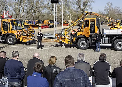Der ausgestellte Unimog U 423 mit langem Radstand und einer Leistung von 170 kW (231 PS), ist mit einer Hubarbeitsbühne sowie einer „Drehschemel-Schienenführung“ ausgerüstet. Er kann so auf Schienennetzen mit engen Kurvenradien, wie zum Beispiel Straßenbahnen, eingesetzt werden. Dabei lässt sich der Unimog von der ausgefahrenen Hubarbeitsbühne aus – beispielsweise bei der Wartung von Oberleitungen oder Inspektionsfahrten – fernsteuern. Einen erheblichen Vorteil bei solchen Einsätzen stellt hier der hydrostatische Fahrantrieb dar, der es erlaubt, die Fahrgeschwindigkeit stufenlos einzustellen und das Fahrzeug punktgenau von der Arbeitsbühne aus zu bedienen.