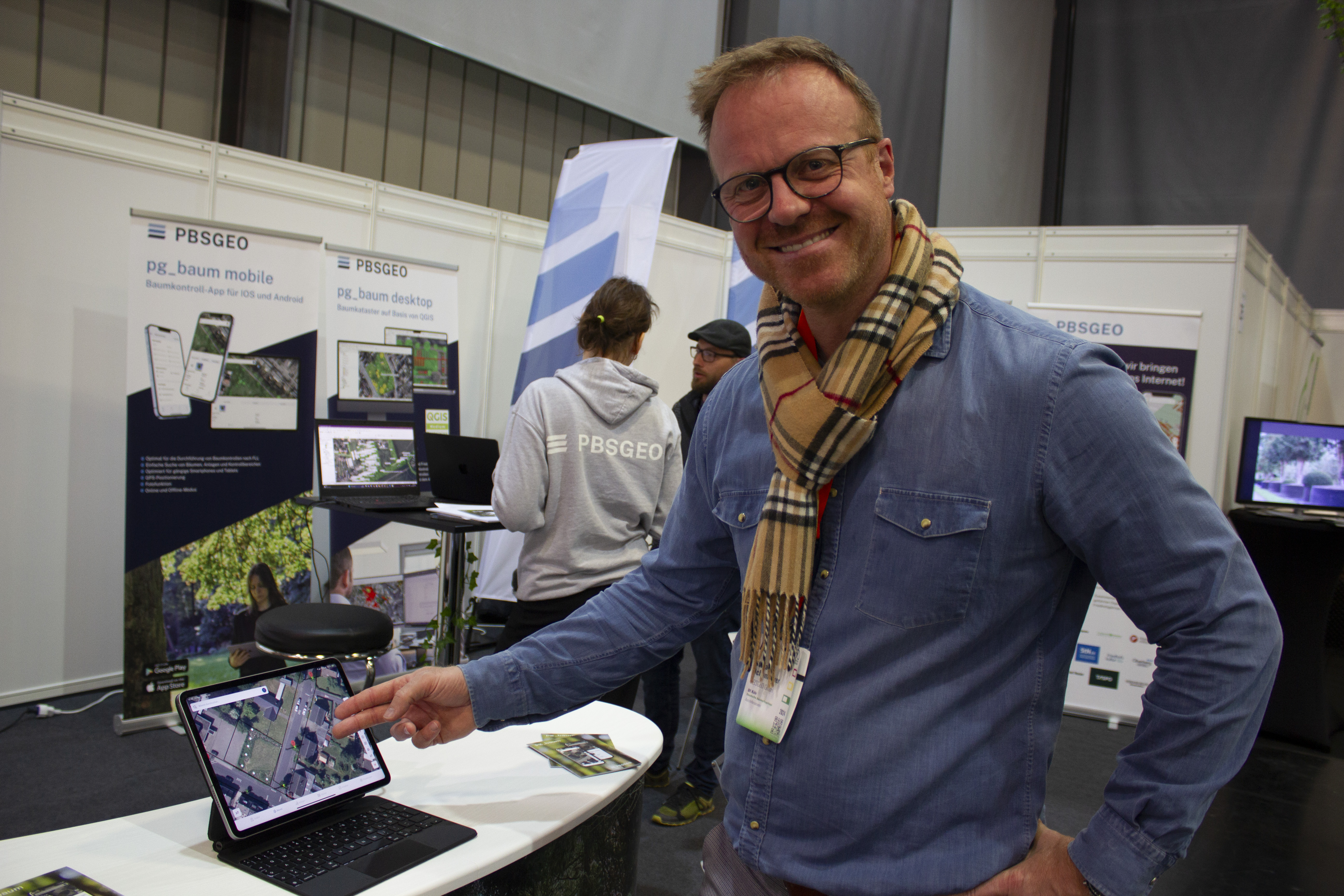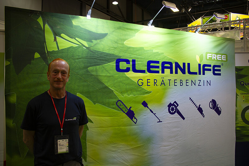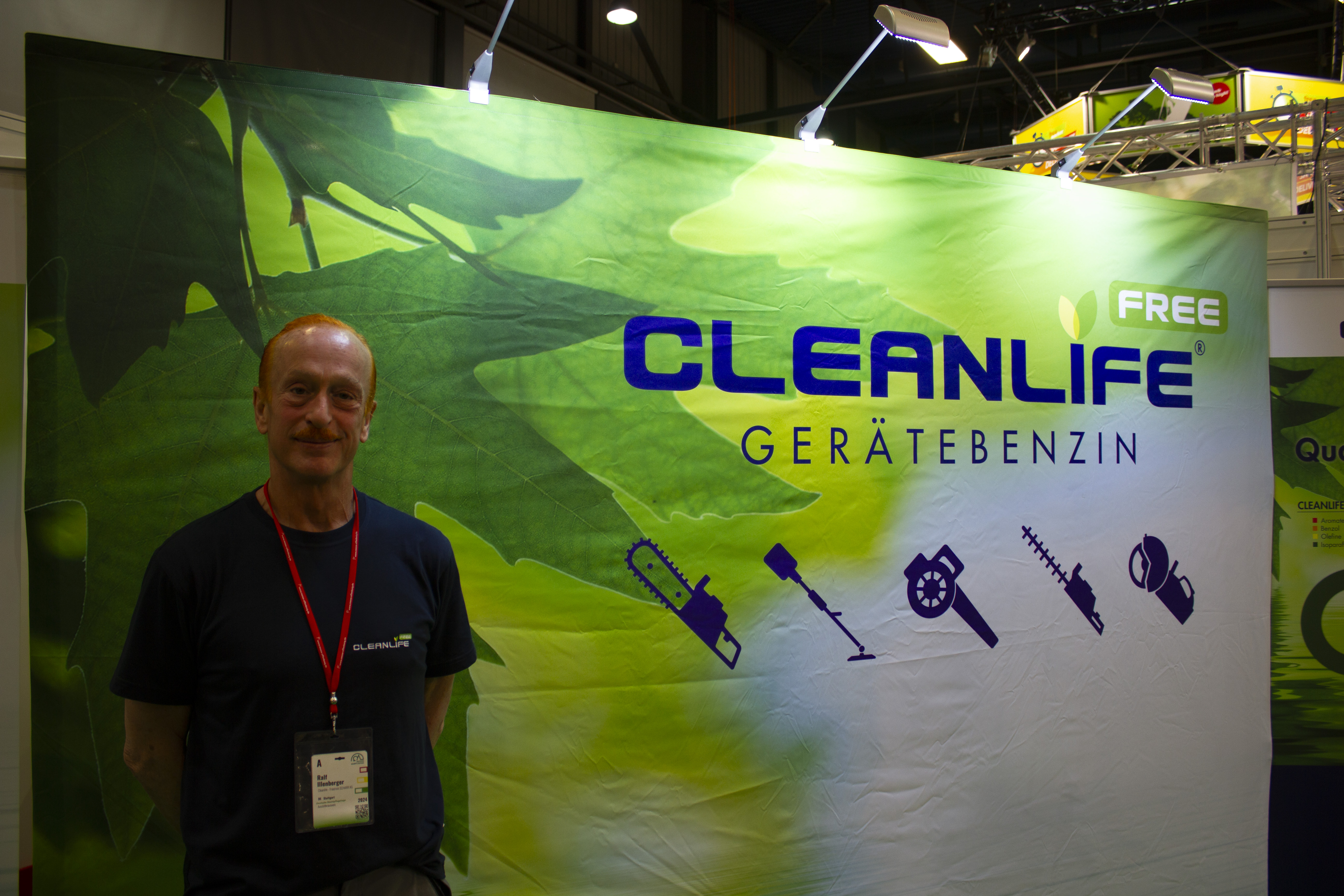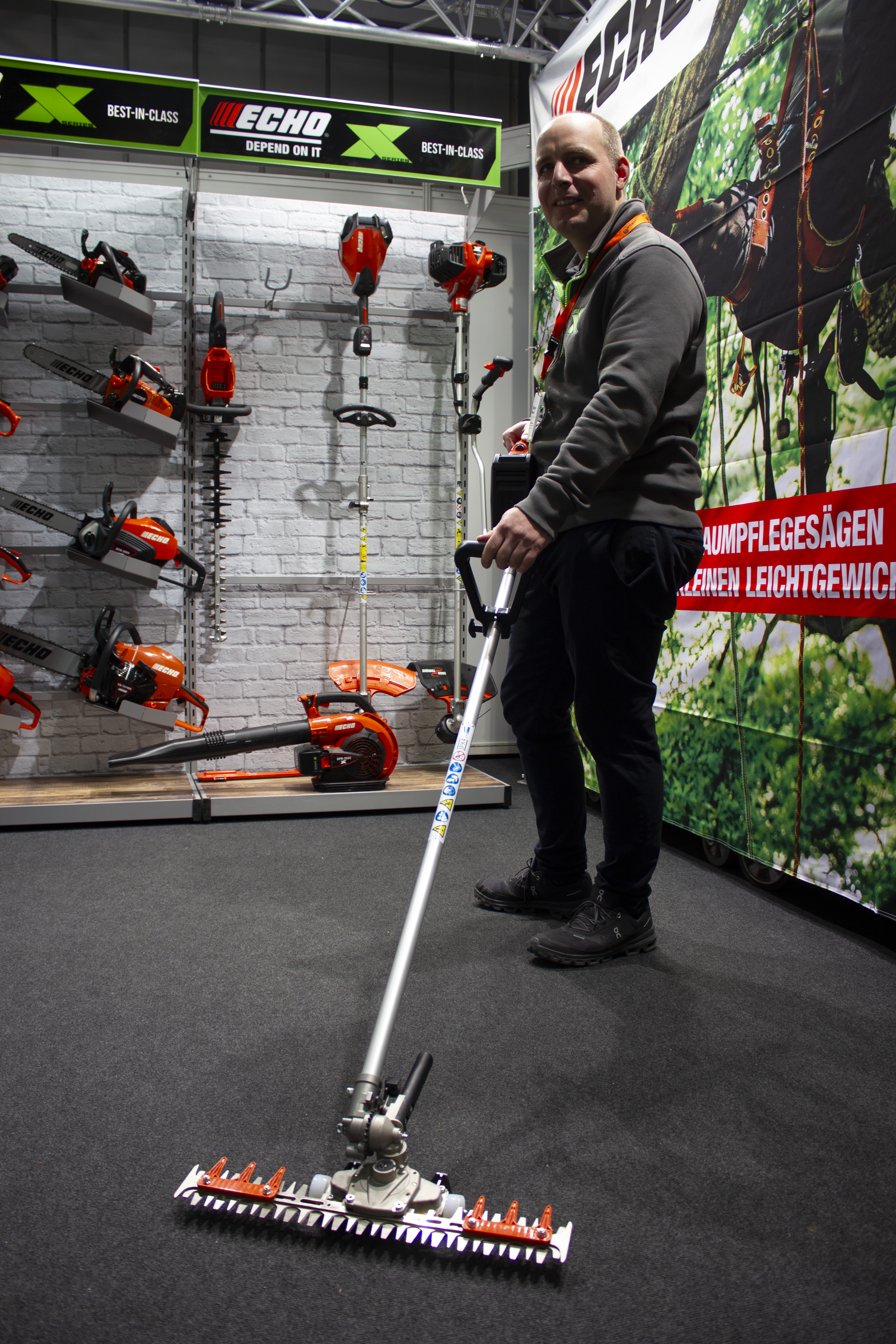 Doch auch Akkumaschinen gibt es auf der Messe zuhauf. Neben Stihl und Husqvarna ist der Vertrieb von Echo Motorgeräte ebenfalls präsent. Hier führt Geschäftsführer Stefan Beck durchs Maschinenportfolio. Neben den zahlreichen handlichen Motorsägen, die bei den anwesenden Baumpflegern auf einiges Interesse stoßen, ist mit dem neuen DTT-2100 auch ein handlicher Akku-Balkenmäher verfügbar. „Damit ermöglichen wir ein schnelles und vor allem schleuderfreies Mähen“, erläutert Beck. Je nach Untergrund kann der Balkenmäher auf Rollen oder Kufen geführt werden. Der gewünschte Schnittwinkel lässt sich unkompliziert mit einem Hebel am Balken einstellen. Bei den Akkus haben die Anwender die Auswahl zwischen einem kleinen und einem großen Modell, die laut dem Geschäftsführer für 40, beziehungsweise 80 Minuten Arbeitszeit sorgen.