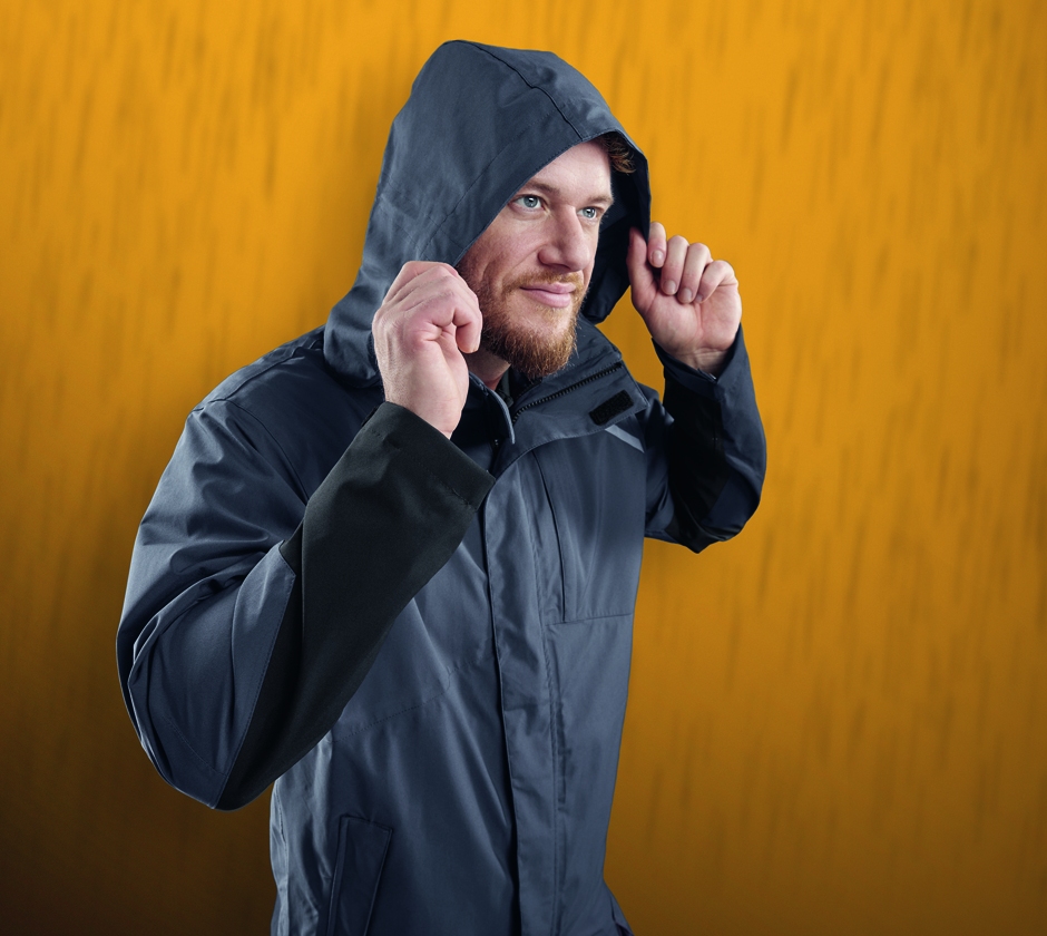 Um hier vorzubeugen, hält die DBL verschiedene Kollektionen mit sinnvoll ausgewählten Kleidungsteilen für die unterschiedlichsten Anforderungen parat. So wie bei der neuen Kollektion Forward. Abgesehen von Bundjacke, Bund- und Latzhose sowie Shorts ermöglicht hier die Auswahl an Oberteilen einen breiten Spielraum, um angemessen auf die klimatischen Verhältnisse zu reagieren. So wie die leichte Wetterjacke. „Sie bietet neben gut durchdachten Details wie eine weitenverstellbare Kapuze, verlängertes Rückenteil und Belüftungszonen ein optimales Feuchtigkeitsmanagement, ist wasserdicht und atmungsaktiv“, erklärt der Workwear-Experte. „Die Wassersäule beträgt 8.000 mm – mit diesem Wert wird angezeigt, ab wie viel Druck ein Material Wasser durchlässt. Je höher der Wert, desto besser.“ Damit ist der Profi bei Nieselregen wie auch bei Starkregen gut geschützt.