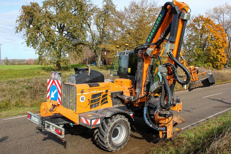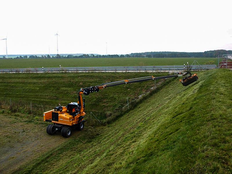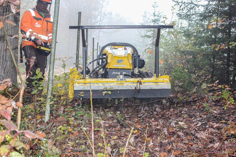 „Neben der Neuheit werden aber auch noch zwei größere Modelle der erfolgreichen Robo-Serie auf der Agritechnica zu sehen sein: der RoboGREEN evo sowie ein RoboMAX“, verrät Verkaufsberater René Birkefeld. Dabei überzeugt der 40-PS-starke RoboGREEN evo mit einem hohen Drehmoment und erstklassiger Zuverlässigkeit. Sein einzigartiges Design sorgt für optimale Sicherheit bei jedem Einsatz. So können dank der komplett geschlossenen seitlichen Verkleidung auch Arbeiten im groben Dickicht dem Multifunktions-Geräteträger nichts anhaben. Zusätzlich bietet der flache Bodenrahmen dem Motor und den anderen Komponenten Schutz. „Mit seinen hinten hochlaufenden Gummiketten sowie dem herabgesetzten Schwerpunkt schafft der RoboGREEN evo mühelos Steigungen bis 55°“, weiß Birkefeld. Energreen bietet für die 1.040 kg schwere Maschine ein 18-teiliges Anbaugerätesortiment an, angefangen vom Mähkopf über eine Kehrmaschine bis hin zum Schneeschild. Dank der Kombination aus hydraulischen Schnellkupplungen mit Montageplatte dauert ein Wechsel nur wenige Minuten. Seit diesem Jahr gibt es für den RoboGREEN evo sogar einen separaten Auslegearm mit dem nun auch Arbeiten bis zu einer Weite von maximal 3,5 Metern möglich sind. Auch sein „großer Bruder“, der RoboMAX, ist dank der Fülle an Anbaugeräten multifunktional einsetzbar. Aufgrund seiner höheren Leistungsfähigkeit von 75 PS zeigt der gelbe Tausendsassa besonders gerne im Bereich Wald und Forst sein Können.
