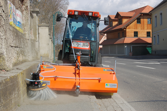 Der Seitenbesen ist individuell einstellbar. Hier kann der Druck, mit dem der Seitenbesen am Boden andrückt eingestellt werden. Serienmäßig ist eine Einstellspindel angebracht, mit der man den Seitenbeseneingriffswinkeln einstellen kann, um auch bei abgefahrenem Besatz den Eingriffswinkel der Seitenbürste optimal einstellen zu können. Um beim Einsatz den feinen Staub zu binden und dadurch die Staubentwicklung zu mindern, ist eine Wasserbesprühung mit speziellen feinzerstäubenden Düsen erhältlich. Je nach Anforderung bzw. Voraussetzungen am Trägerfahrzeug, kann die Kehrmaschine mit Hydraulik oder auch mit Zapfwelle angetrieben werden.