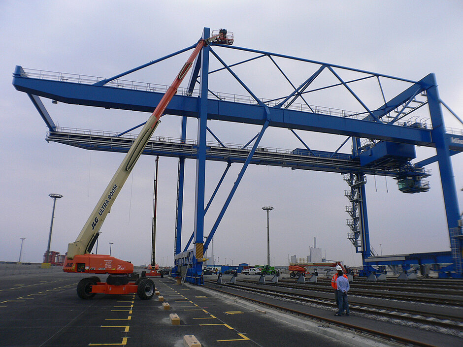 Die größte JLG Teleskopbühne hilft die weltweit größten Containerbrücken aufzubauen und zu warten – Tiefwasserhafen Wilhelmshaven wird fertig