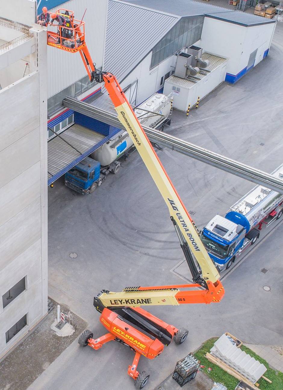 Am Freitag hatte die Ley-Krane GmbH in Gummersbach ihre Gelenkteleskopbühne JLG 1500 AJP geliefert bekommen. Am Montag war sie bereits im Arbeitseinsatz. Es gilt, über einen längeren Zeitraum an der neuen Produktionsanlage der Eurolat GmbH in Lindlar mit-zu-bauen. Eurolat ist ein Sprühtrocknungsbetrieb, der vorrangig auf der Grundlage von Milchprodukten und Pflanzenfetten Pulverprodukte produziert. Diese Halbfabrikate werden in Nahrungsmitteln und in Futtermitteln eingesetzt. Zur Erweiterung der Produktionskapazitäten wird eine neue Produktionsanlage, die 40 m hoch, 17,50 m tief und 21 m breit ist, gebaut. Im Einsatz ist die JLG 1500AJP beim Einbau von Stützen und Setzen von Wandelementen. Es ist außerordentlich interessant, zu beobachten, wie die Arbeitsbühne ihre gewaltigen Reichweiten, sowohl was Höhe als auch was Weite oder aber seitliche Einsätze anbelangt, nutzen kann. Es zeigt sich, dass die von JLG genannten 74.000 m² Einsatzbereich nicht übertrieben sind.