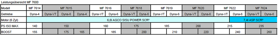 Diese Erfolgsgeschichte wird nun mit den vier neuen Modellen MF 7614 (140 PS), MF 7615 (150 PS), MF 7616 (160 PS) und MF 7618 (175 PS) fortgesetzt. Die neuen Traktoren ersetzen die 6-Zylindermodelle der bewährten Vorgängerbaureihen MF 5400, MF 6400 und MF 7400.