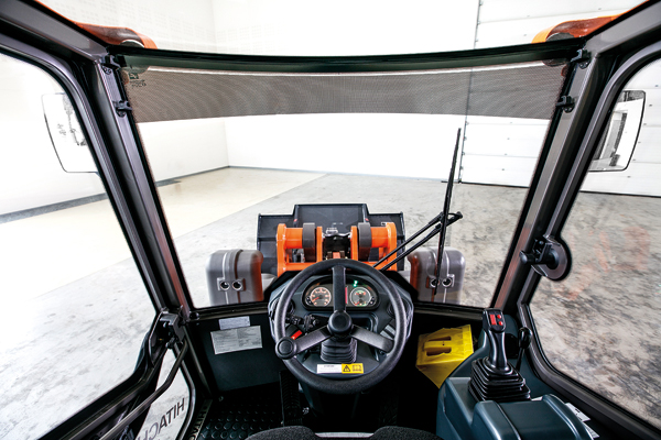 Da eine gute Arbeitsumgebung nachweislich zu höherer Produktivität führt, fördern die geräumige Kabine mit Komfortsitz und einstellbaren Armlehnen sowie die verstellbare Lenksäule das ermüdungsarme Arbeiten. Die 360° Rundumsicht sorgt dafür, dass der Bediener immer den ganzen Arbeitsbereich überblicken und somit wesentlich präziser arbeiten kann. Das erweiterte Multifunktionsdisplay hilft dabei, immer alle wesentlichen Funktionen der Maschine im Blick zu behalten.Die ergonomisch gestalteten Steuerelemente sowie der Multifunktions-Joystick mit Fahrtrichtungsschalter, das ausgeglichene Lenkverhalten des Radladers und der geräuschärmere Motor runden das positive Arbeitsumfeld ab.