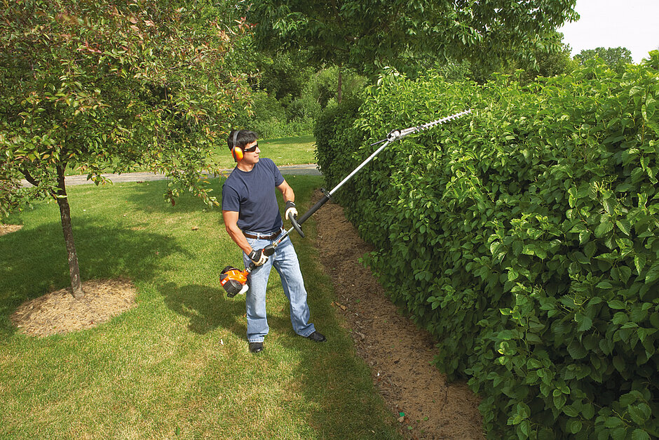 Sicherheit ist auch ein wichtiges Thema beim Form- oder Erhaltungsschnitt hoher Hecken, denn dort verlangt die Arbeitssicherheit zeitraubenden Gerüstbau oder vergleichbar aufwändige Sicherungsmaßnahmen. Gut, dass die vielseitige HCA-265ES auch als Heckenschere eingesetzt werden kann: So spart man sich den ganzen Sicherungsaufwand, denn durch den langen Schaft kann der Anwender selbst hohe Hecken ganz ohne Leiter zurückschneiden.