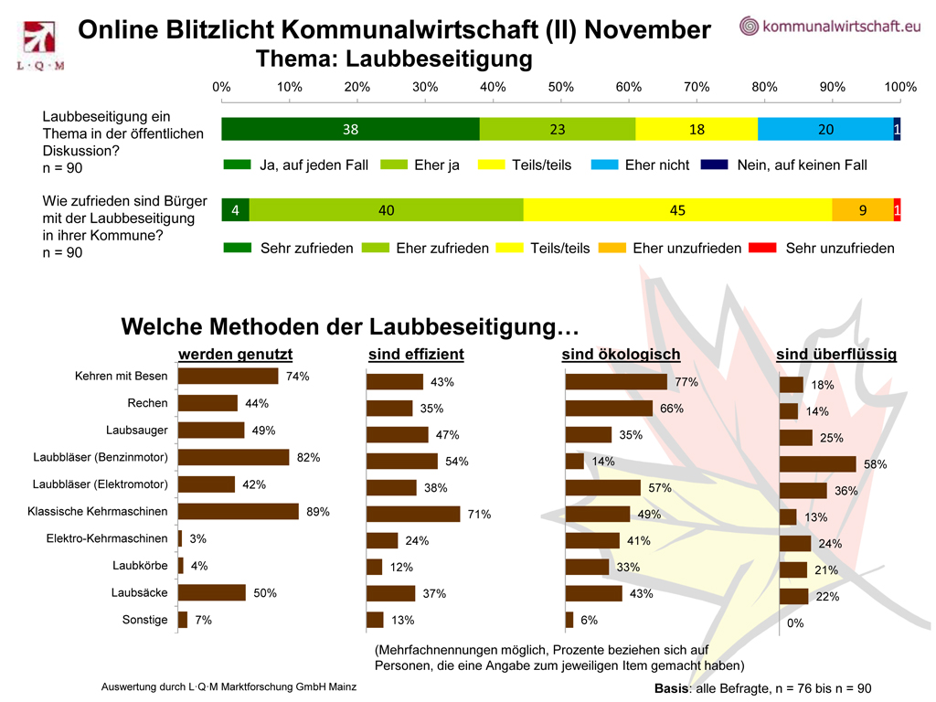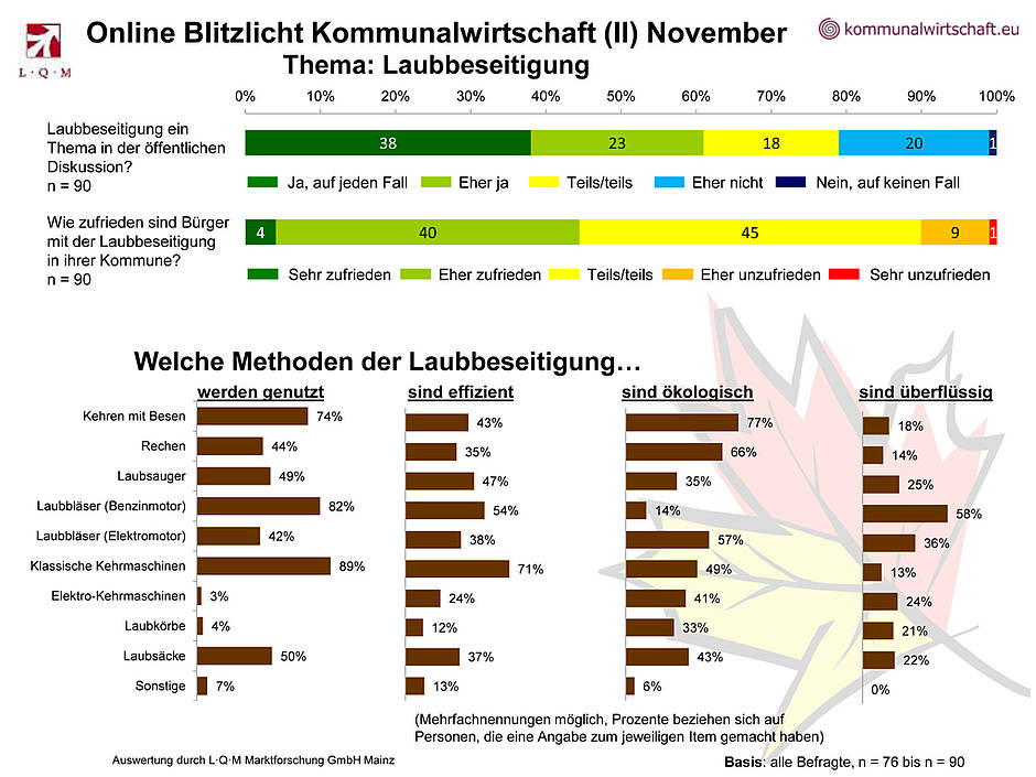 „Laubbeseitigung" war im November das Thema der monatlichen Online -Umfrage, welche von dem Mainzer Marktforschungsinstitut L•Q•M und dem Portal Kommunalwirtschaft-EU durchgeführt wird. Die Umfrage ergab, dass die „Laubbeseitigung" zwar in der öffentlichen Diskussion ein Thema zu sein scheint (immerhin gaben etwas über 60% der Befragten an, dass das Thema in ihrer Kommune erörtert wird), jedoch scheint die Zufriedenheit mit eben dieser noch verbesserungswürdig zu sein. Nur 44% der Befragten äußerten, dass sie zufrieden mit der Laubbeseitigung in ihrer Kommune seien.