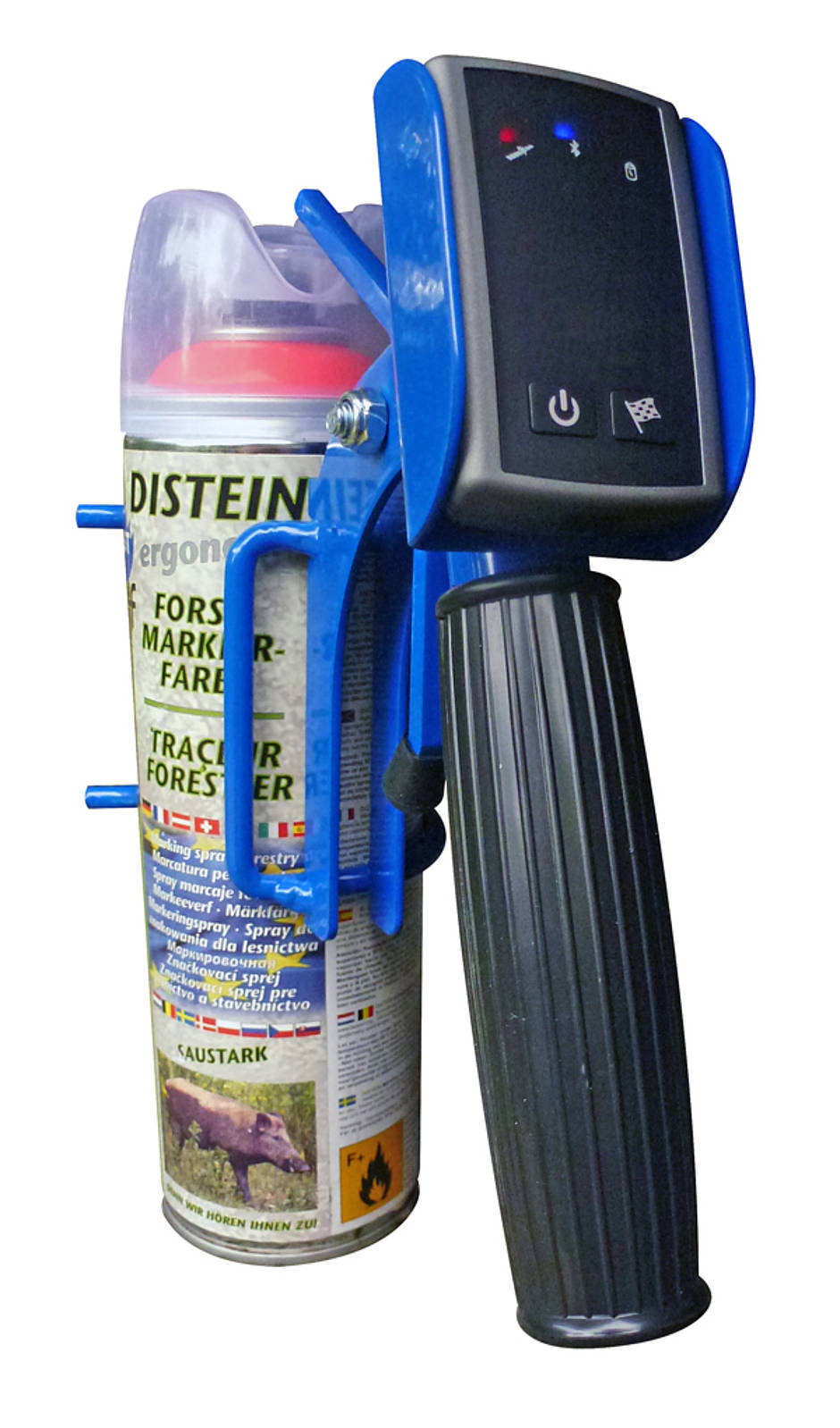 Beim GPS-Farbmarkierer wurde der DISTEIN Sprühgriff Ergonom um eine Halterung für einen GPS-Empfänger erweitert. Während der positiv-negativ-Auslese oder dem Einmessen von Rückegassen kann im 1-Hand-Verfahren per Knopfdruck die Position ermittelt und für die spätere Auswertung am Computer festgehalten werden. Das System wurde von einem Team junger Förster praxisnah entwickelt und wird inklusive Schulung angeboten (Ansprechpartner: Kristina Wedekind, <link>gpsfarbmarkierer@gmail.com).