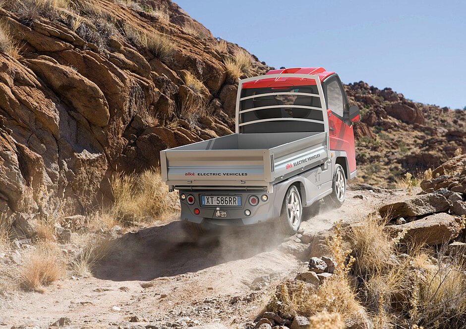 Als erster in dieser Leistungsklasse bietet Alkè neben dem bewährten Heckantrieb auch einen permanenten Allradantrieb an. Beide Varianten wird es mit zwei verschieden Radständen geben, die Ladeflächen von 220 cm bzw. 270 cm Länge und 140 cm Breite haben. Auch die Zuladung von 1000 kg ist in dieser Klasse ein Novum. Mit der schmalen Bauweise von 140 cm und einem geringen Radius von 2,70 m/3,30 m kann das Fahrzeug auch auf engsten Wegen eingesetzt werden. Die Fahrzeuge sind grundsätzlich nach Zulassungsverordnung N1 (Transporter bis 3,5 Tonnen) zulassungsfähig. Die bebeheizbare Kabine entspricht modernem Transporter-Standard und bietet genügend Komfort und Platz für zwei Personen. Eine Klimaanlage ist optional erhältlich. Mit einem Schalter kann das luftgefederte Fahrwerk und entsprechend der Antrieb in 4 verschiedenen Positionen eingestellt werden. Eco, Berg, Sport und Anhänger ziehen. Der Wechselstrommotor entwickelt 230 Nm und erlaubt eine Anhängelast bis zu 4000 kg. Zulassungsbedingt ist jedoch diese Anhängelast jedoch auf immer noch in dieser Klasse einmalige 1500 kg reduziert. Durch ein optionales Wechselbatteriesystem sind auch größere Reichweiten als 200 km möglich.