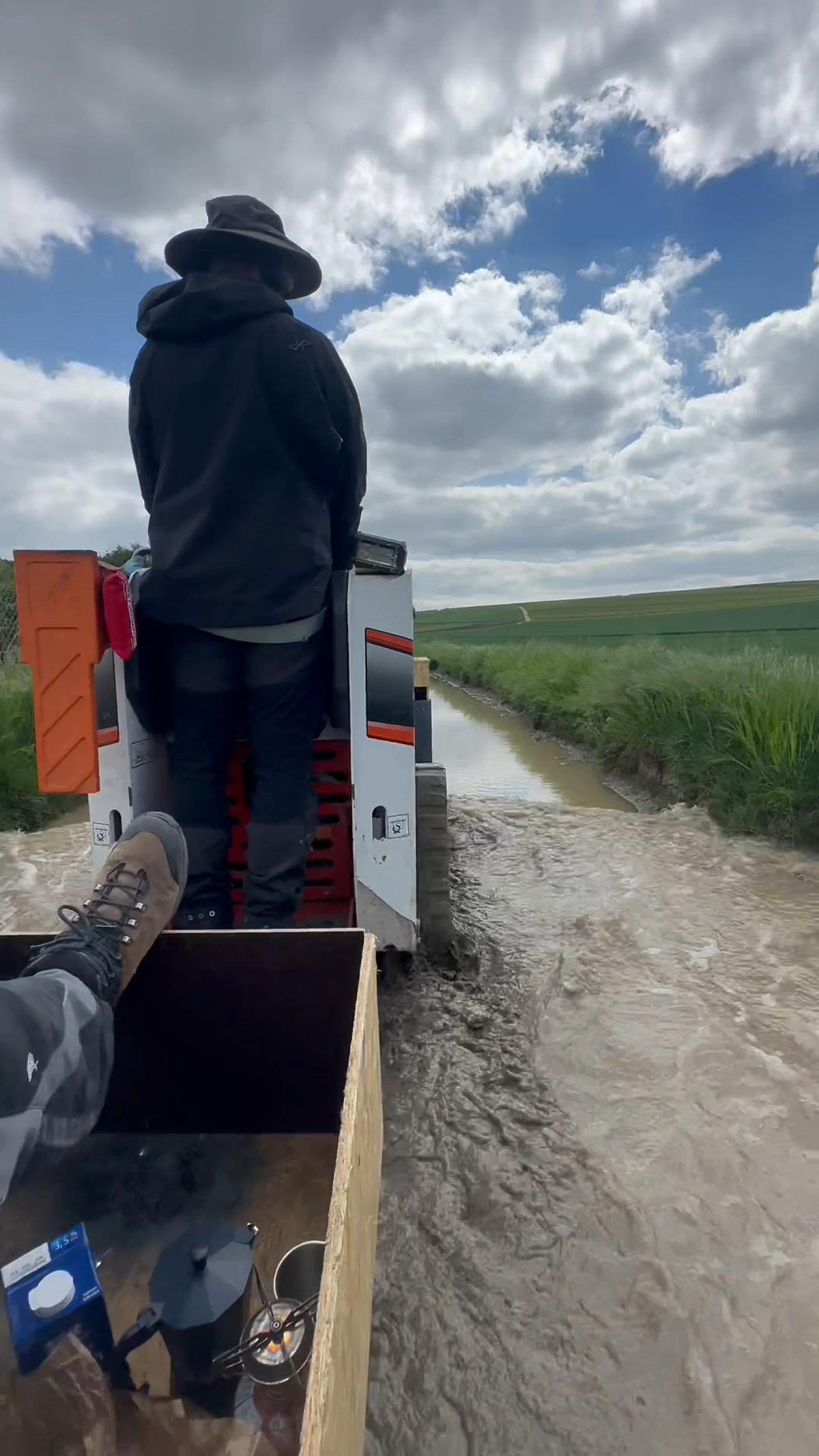 So starteten die beiden an einem Sonntagmorgen ihre Reise – insgesamt 74 Stunden Fahrt nonstop. Alle drei bis vier Stunden wechselten sie sich beim Fahren ab. Der Beifahrer im Schaukelstuhl hatte dabei die verantwortungsvolle Aufgabe, die Route weiter zu optimieren. Sie führte bewusst abseits bewohnter Gebiete, um Lärmbelästigungen in der Nacht zu vermeiden. Größtenteils verlief also die Strecke über Feld- und Wanderwege, Wiesen und Waldstücke – ideales Terrain für den Raupenlader. „Ursprünglich hatte uns der Routenplaner eine Strecke direkt vorbei am Heidelberger Hauptbahnhof vorgeschlagen – aber das haben wir dann doch nicht gemacht“, schmunzelt Höhn. Bei Gernsheim überquerten sie per Fähre den Rhein – und ernteten neugierige Blicke. Auch Jäger, Förster und so manches scheue Reh schauten beim Anblick des Bobcat-Duos verdutzt drein.