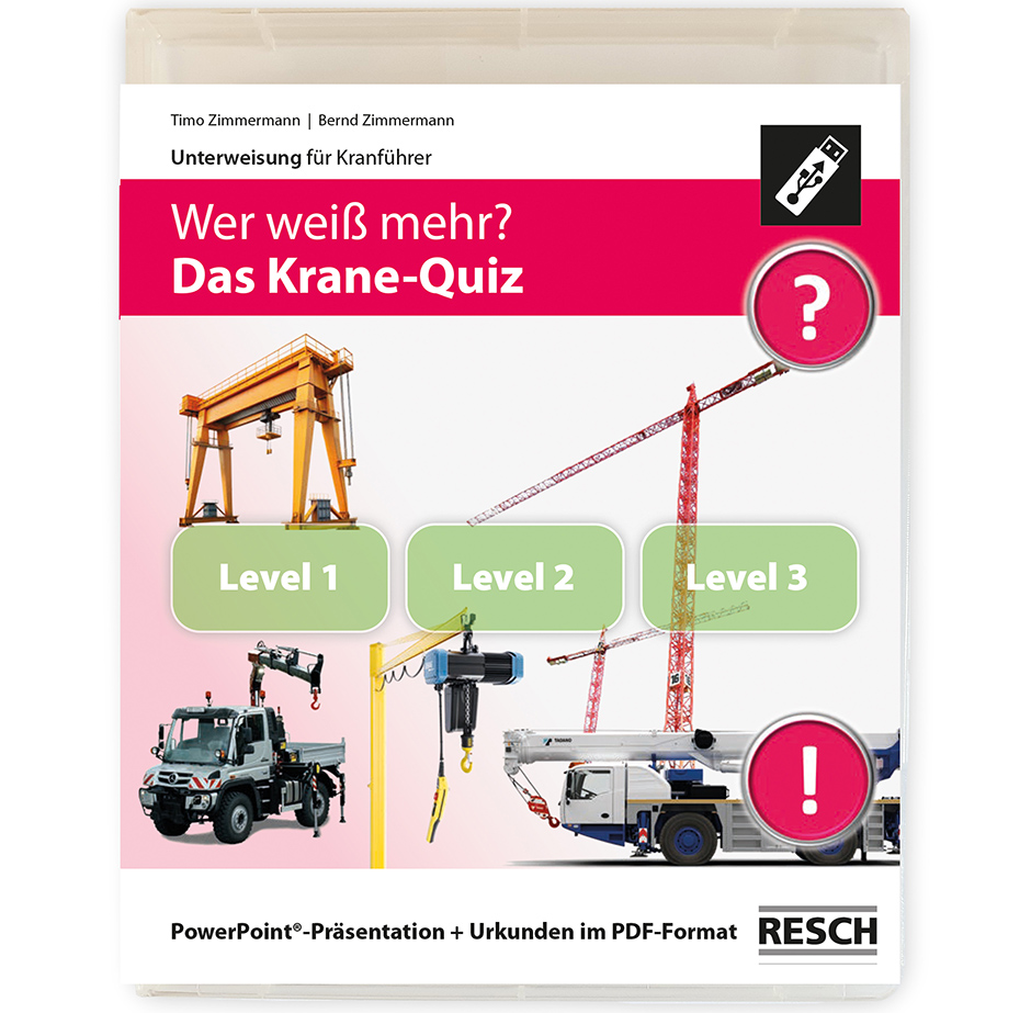 Einmal im Jahr müssen Kranführer unterwiesen werden. Dabei lernen die Teilnehmer am meisten, wenn sie aktiv mitarbeiten und mitdenken. Deshalb ist die neue PowerPoint-Präsentation des Resch-Verlags wie ein Quiz gestaltet. In drei Leveln sind darin 15 Fragen aufgeteilt, die immer schwieriger werden, sodass am Ende auch echte Profis ins Grübeln kommen. Übrigens sind die Fragen für Kranführer aller Bauarten relevant – vom Schwenkarmkran bis zum Turmdrehkran.