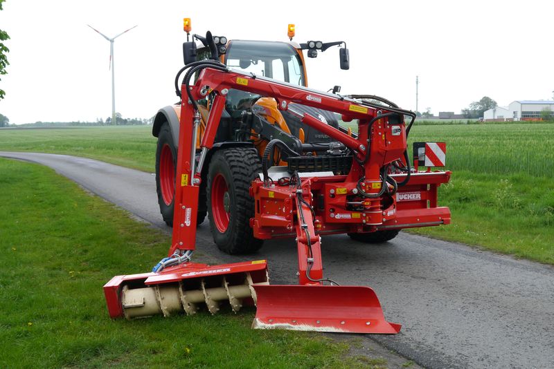 Seit fünf Jahren bietet die Firma Dücker mit der Banketträumschnecke BRS 15 ein Anbaugerät zur Montage an bereits vorhandene Trägerfahrzeuge an. Damit wird maschinelle Bankettpflege für einen erweiterten Anwenderkreis möglich, und das auf Straßen, die für die großen Bankettfräsen kaum befahrbar sind. Technisch gesehen besteht die BRS 15 aus einem modifizierten 5,4-Meter-DUA-Auslegerarm mit 1,5 Meter Arbeitsbreite. Daran ist als Arbeitsgerät eine 1,3 Meter lange Förderschnecke mit verschleißfesten Schneckenwindungen montiert. Die Banketträumschnecke BRS 15 wird an die Frontanbauplatte angebaut, der Antrieb erfolgt über die Frontzapfwelle des Trägerfahrzeuges. Auf dem Verschieberahmen ist zusätzlich ein separater Räumpflug zum Abschälen der überwachsenen Asphaltflächen montiert. Er arbeitet vor der Fräs-Schnecke und entfernt Überwuchs vom Asphalt.