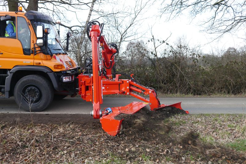 Die Förderschnecke schält das Bankettmaterial ab und kann es wahlweise nach außen verteilen oder zur Fahrbahn heranziehen. So können Bodenunebenheiten ausgeglichen werden. Sowohl der Auslegerarm mit Schnecke als auch der Innenpflug können hydraulisch auf dem Frontrahmen verschoben und eingestellt werden. Das Verschieben erleichtert das Arbeiten um Hindernisse herum wie Leitpfosten, Verkehrsschilder usw. Alle Funktionen, auch die Drehrichtung der Frässchnecke, werden vom Bedienpult aus in der Kabine gesteuert. Somit kann die Banketträumschnecke von einer Person gefahren und bedient werden. Besonders interessant für Lohnunternehmer und Maschinenringe: Stehen keine Bankettpflegearbeiten an, kann der modifizierte (verstärkte) Auslegerarm der BRS 15 mit anderen Anbaugeräten aus dem Dücker Maschinenprogramm bestückt werden.