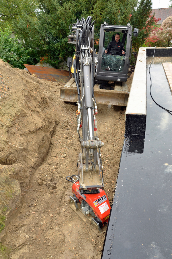 Zu guter Letzt wird der Anbauverdichter angekuppelt. „Beim Auffüllen und Verdichten ist die Maschine unschlagbar. Ich habe nicht nur zwei Geräte in einem, sondern spare auch Personal ein, weil niemand mit der Rüttelplatte hinterherlaufen muss“, sagt Ingo Wörner. Von der Vielseitigkeit des 8MCR ist er begeistert. „Wir können viele Aufgaben wesentlich schneller und besser ausführen. Egal ob graben oder laden, einsanden, Rohre abladen, verdichten oder Paletten mit Pflastersteinen abladen - das alles geht mit nur einer Maschine.“