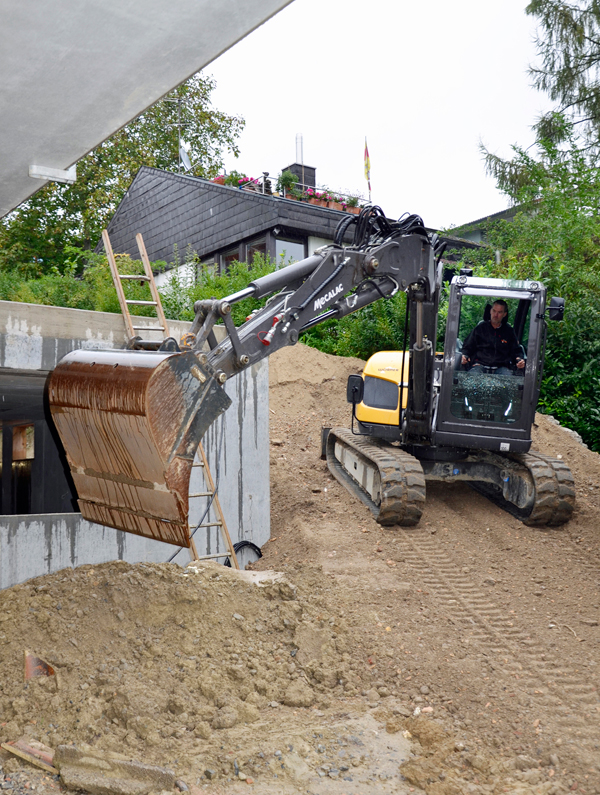 Neben der Tiefgarage soll ein Graben aufgefüllt und der Boden verdichtet werden. Die Platzverhältnisse sind eng, nur wenige Meter stehen zum Manövrieren zur Verfügung. Außerdem muss ein steiler Anstieg überwunden werden - ein Kinderspiel für den Skid-Bagger, dessen Hüllkreis bei 180° gerade mal 2,66 m beträgt. Mit seinen Gummiketten klettert der 8MCR den Erdhügel hinauf, Ingo Wörner hebt mühelos einen gefüllten Löffel nach dem anderen sogar über das Tiefgaragendach hinweg. Das Auffüllen des schmalen Grabens ist kein Problem. Dank der patentierten Mecalac-Kinematik lässt sich der Ausleger um 140° verstellen, nahezu innerhalb der Maschinenbreite kann um 360° geschwenkt werden.