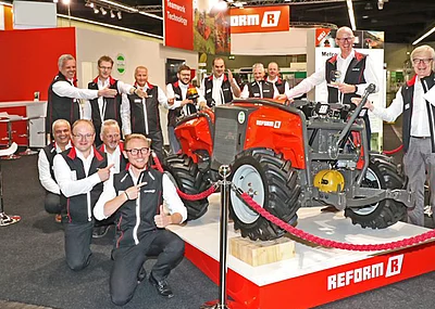 Auf den REFORM Muli T10 X HybridShift wurde ein robuster Dreiseitenkipper sowie ans Heck mittels einer Schnellwechselkonsole ein IRONTECH-Ladekran, welcher eine Ausladung von 7.200 mm und dort eine Hubkraft von 420 kg aufweist, angebaut. Die Rotator-Steuerung mit den diversen Kombigeräten, wie Greiferschalen und Holzgreifer, machen den Ladekran zu einem vielseitig einsetzbaren Arbeitsgerät.