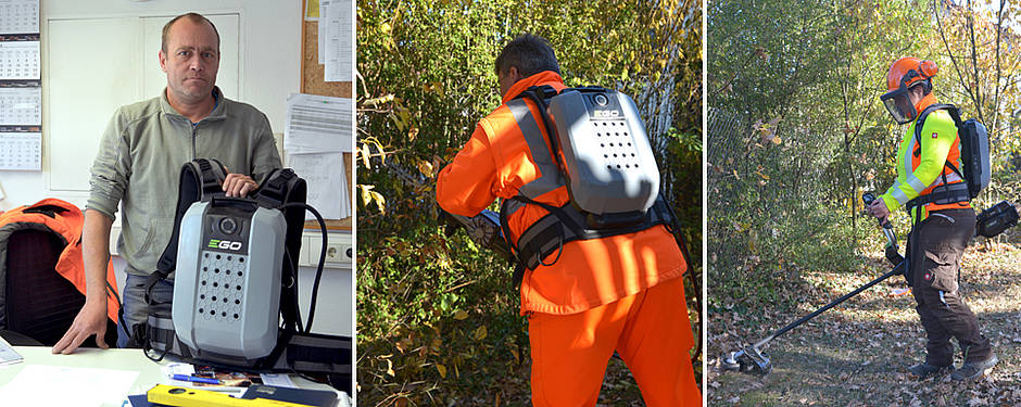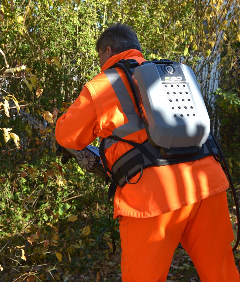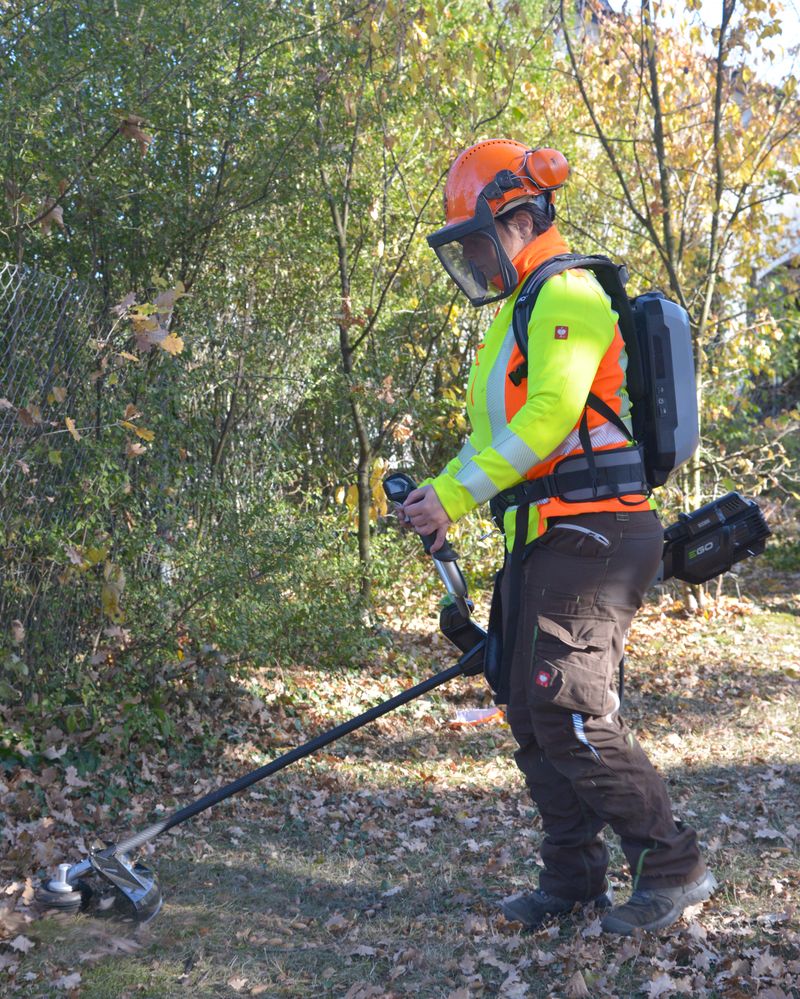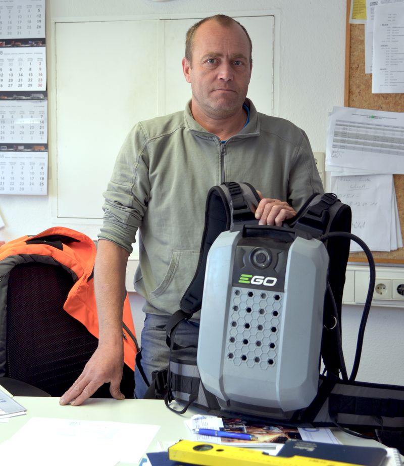 Chef Wolf bringt es auf den Punkt: „Der Riesenvorteil ist, wir brauchen keine Betriebsstoffe mehr, haben also kein Geläpper mit Benzin.“ Sein Mitarbeiter Matthias Hermann sieht es ähnlich: „Wir brauchen keine Kanister mehr mitnehmen. Akku rein und los geht’s. Das ist schon geschickt.“ Sein Lieblingsgerät ist der EGO Freischneider BC3800E: „Mit dem kann man alles mähen, der ist sehr leistungsstark. Wir haben auch andere Hersteller ausprobiert, aber deren Akkus halten nicht so lange.“